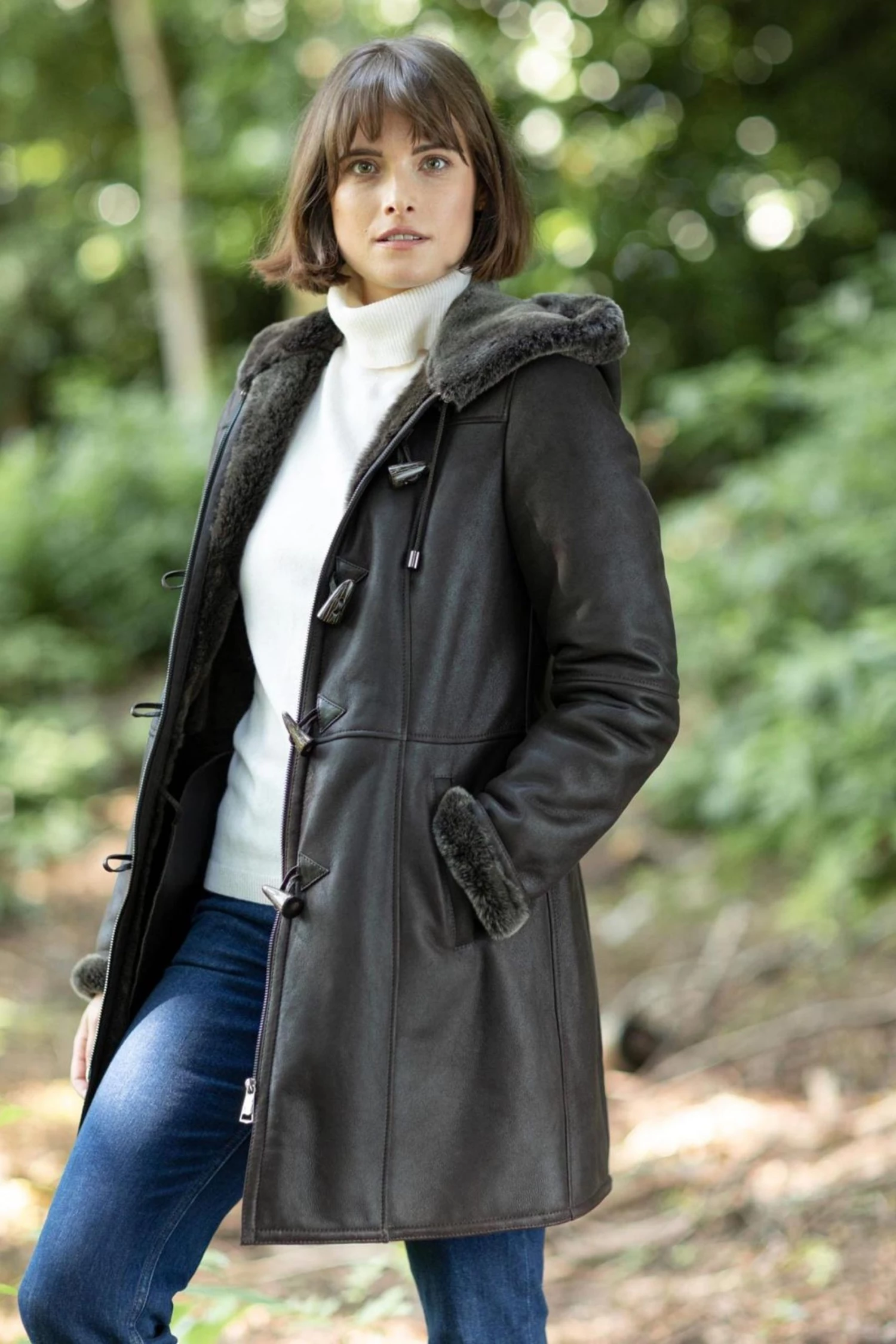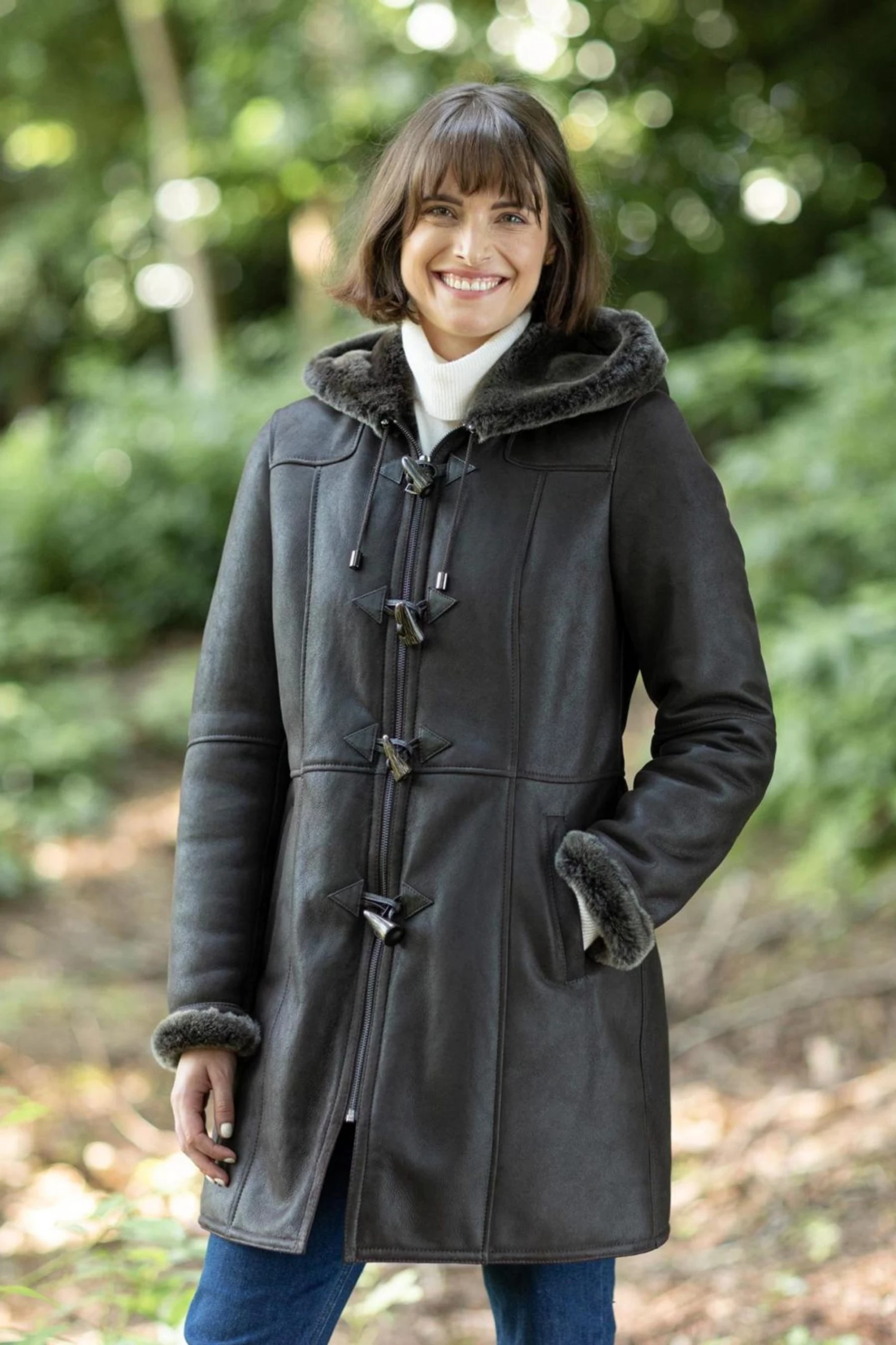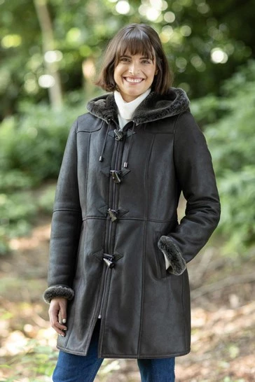 A Lakeland Leather favourite – the perfect duffle inspired coat, crafted from premium quality Merino sheepskin. Dearham is an investment that will keep you warm for years to come. Crafted from 100% sheepskin for a rich appearance, this coat features a cosy hood, traditional toggle fastening with secure zip fastening and adustable turn up cuffs, revealing the sheepskin inner for a touch of luxury. Cut at thigh length with flattering seam detailing, this piece is elegant and timeless. These measurements are based on a size 12 and will vary slightly between sizes. Approximate centre back length: 86cm. Approximate sleeve length from shoulder to cuff: 71cm. Approximate sleeve length from underarm to cuff: 50cm.