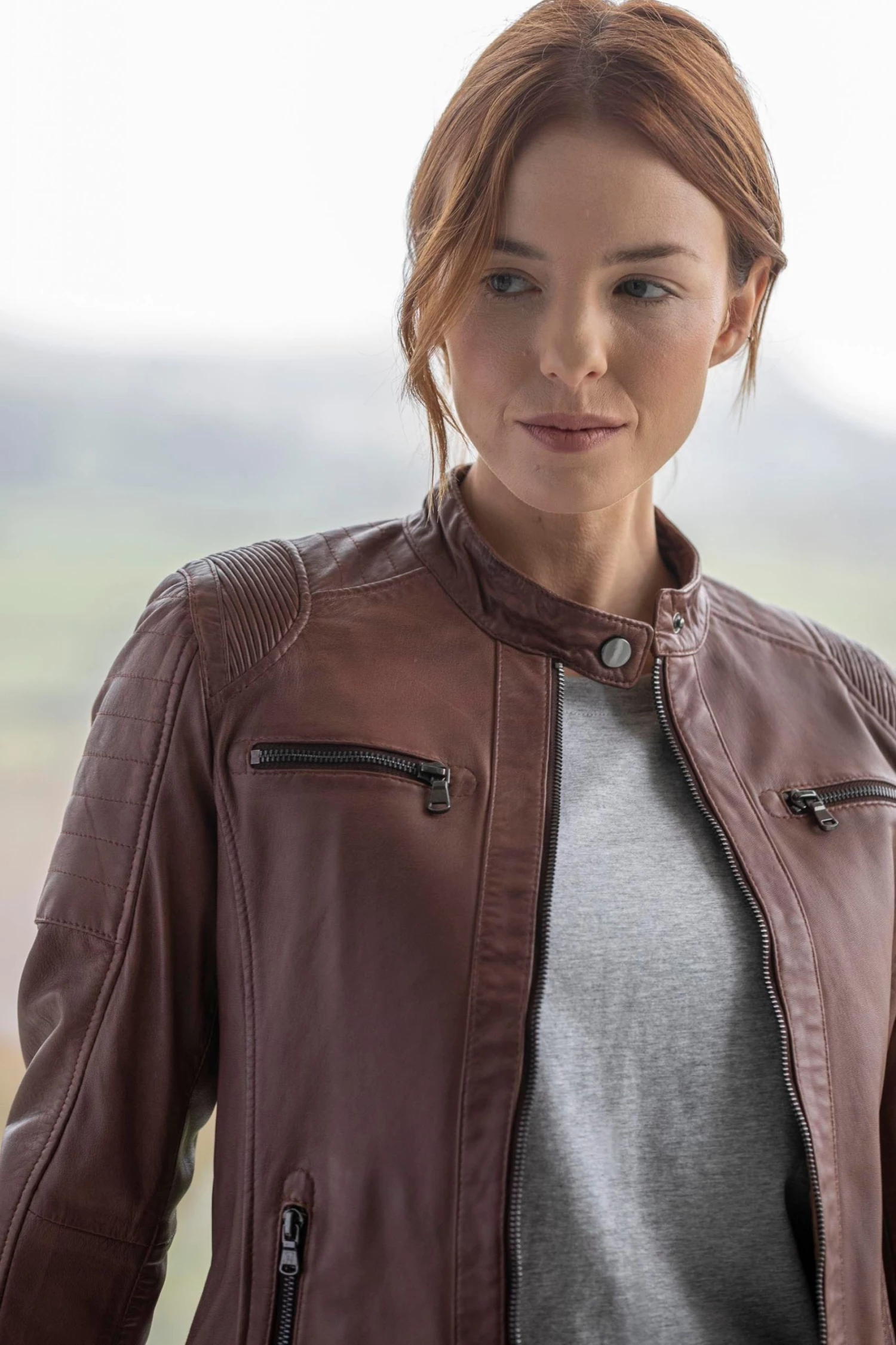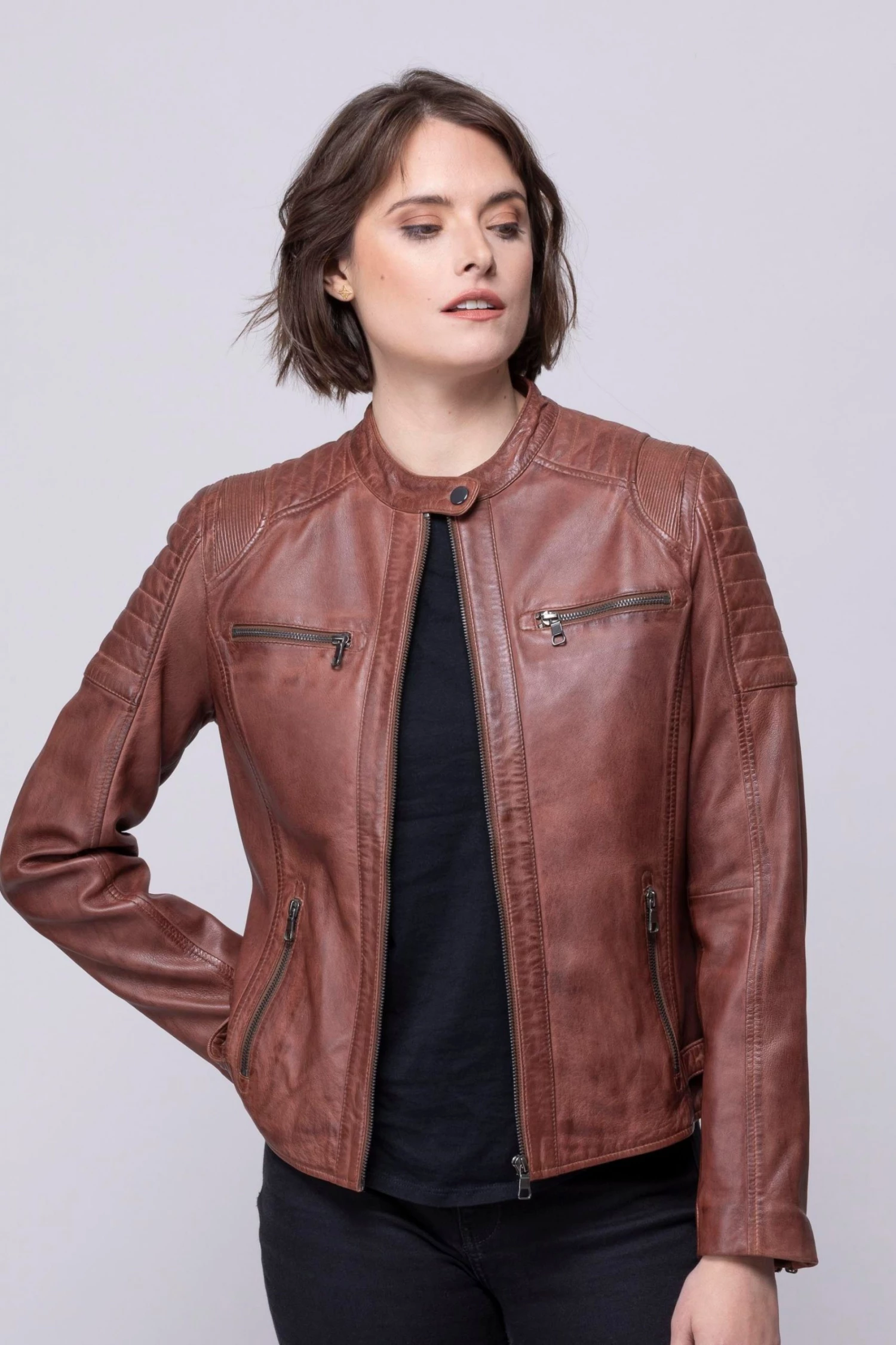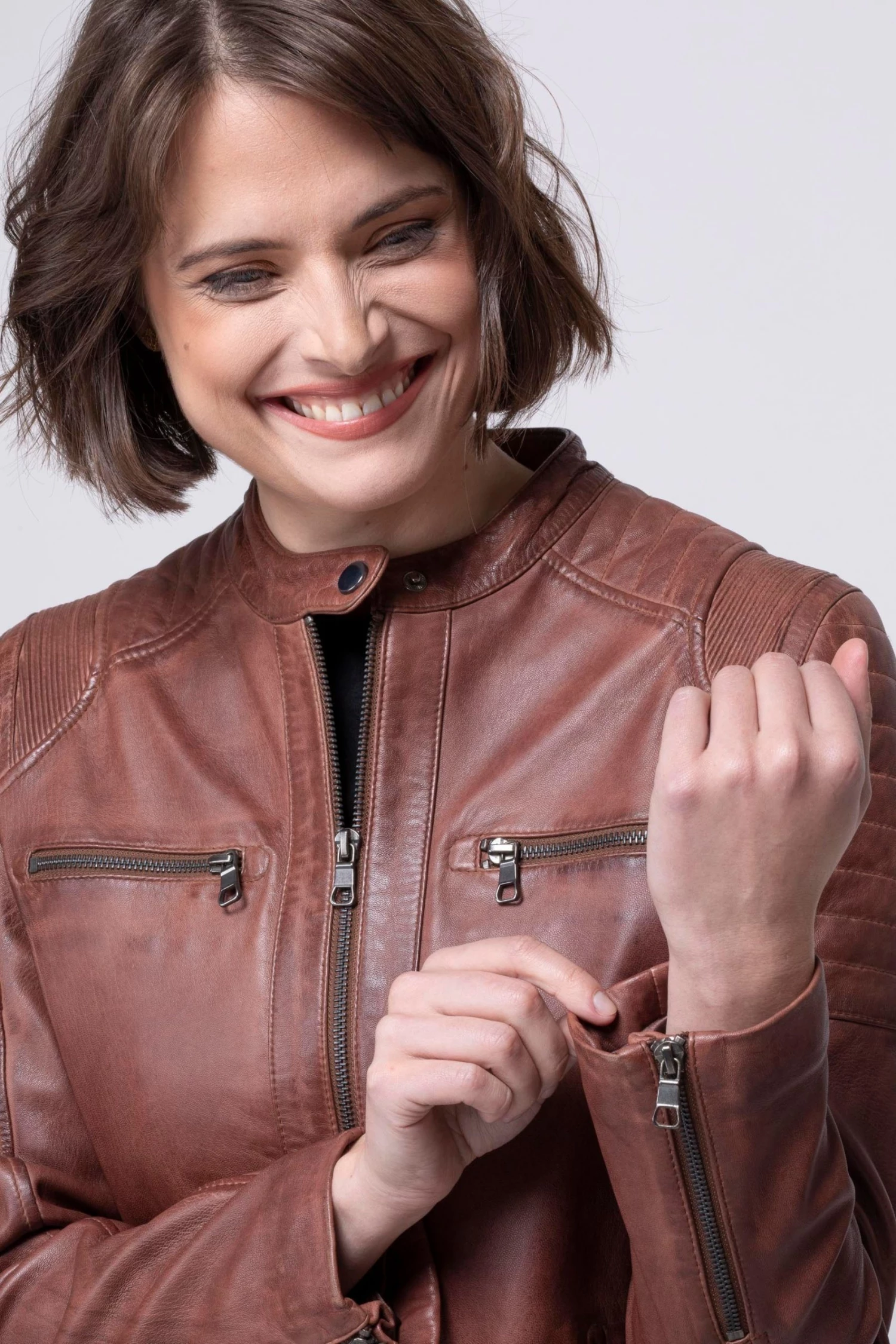 The Buttermere leather racer jacket from Lakeland Leather arrives in consummate style. Crafted in an incredible soft-to-touch leather in a rich bourbon colourway, the Buttermere also benefits from a subtle over-wax to add texture to the heritage appeal. Tapered panels and side buckles ensure a feminine fit, whilst the shoulder detail, chest pockets and zip cuffs play on the biker look.