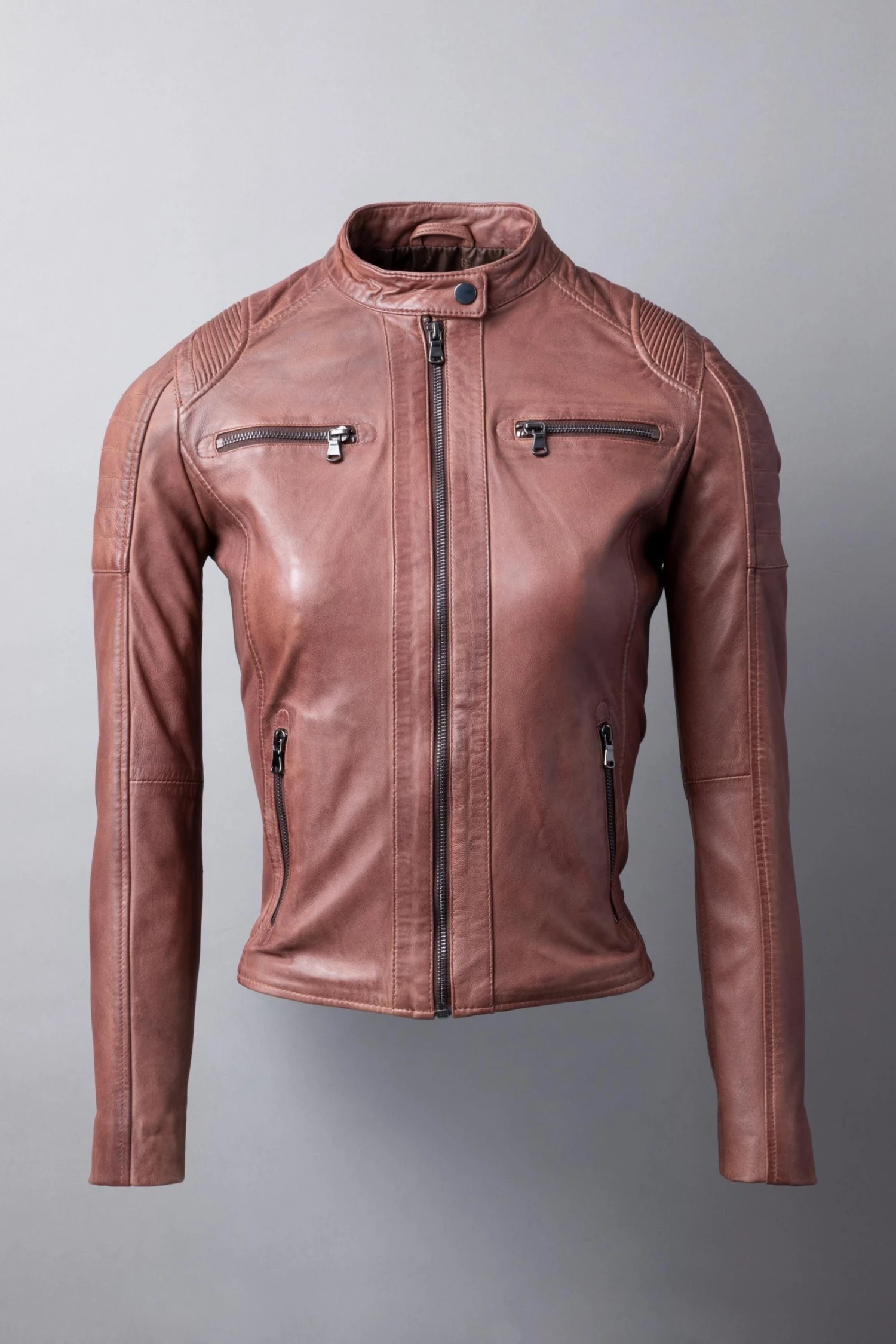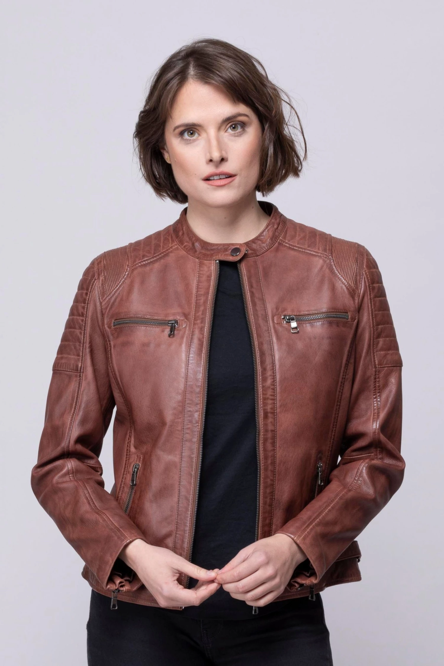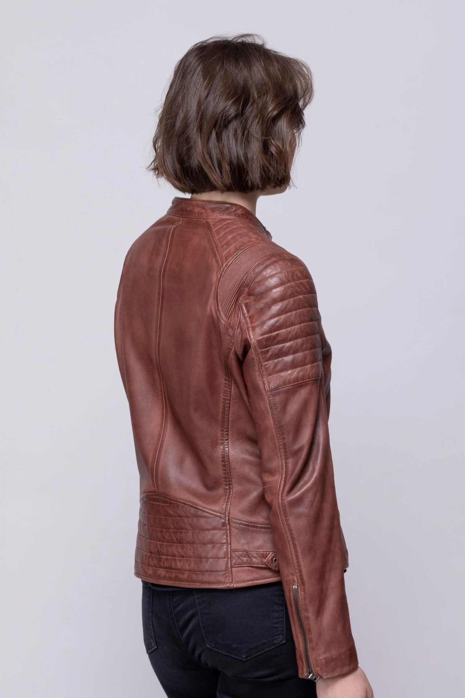 The Buttermere leather racer jacket from Lakeland Leather arrives in consummate style. Crafted in an incredible soft-to-touch leather in a rich bourbon colourway, the Buttermere also benefits from a subtle over-wax to add texture to the heritage appeal. Tapered panels and side buckles ensure a feminine fit, whilst the shoulder detail, chest pockets and zip cuffs play on the biker look.