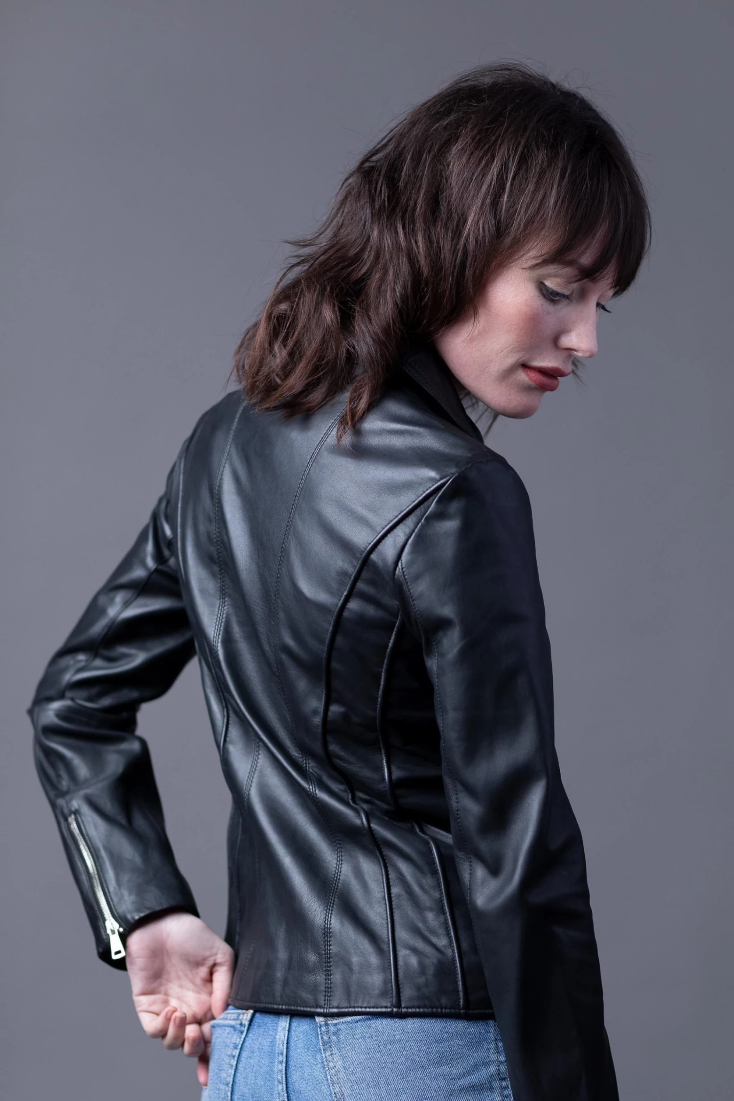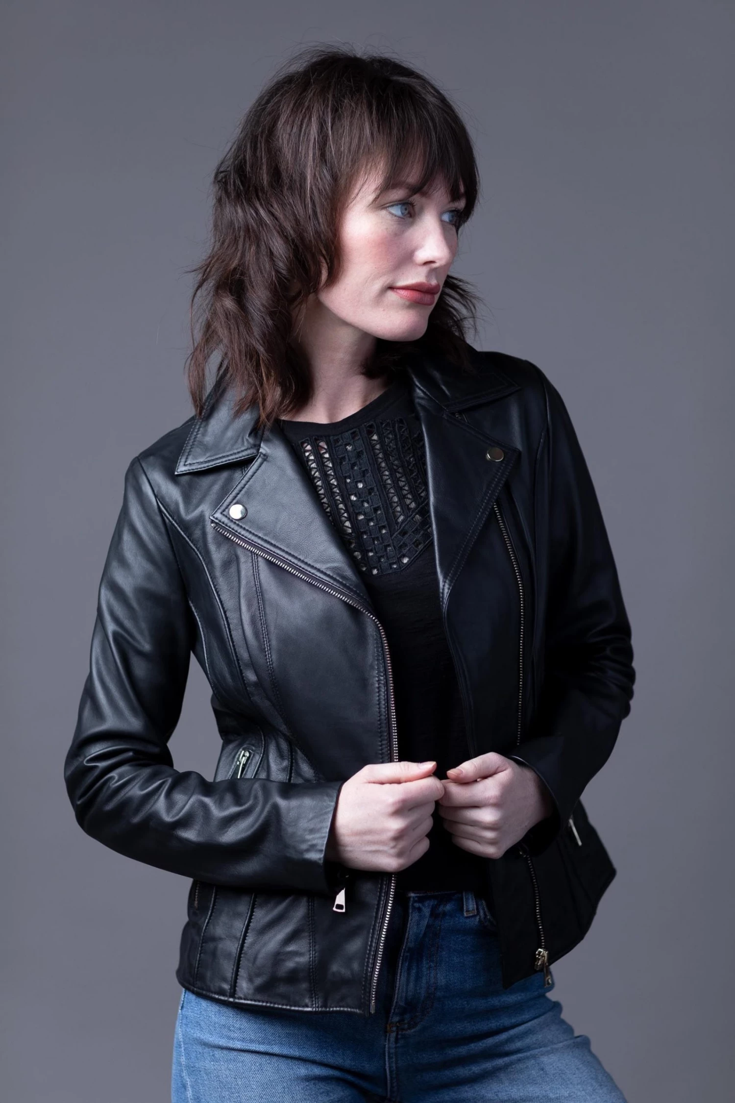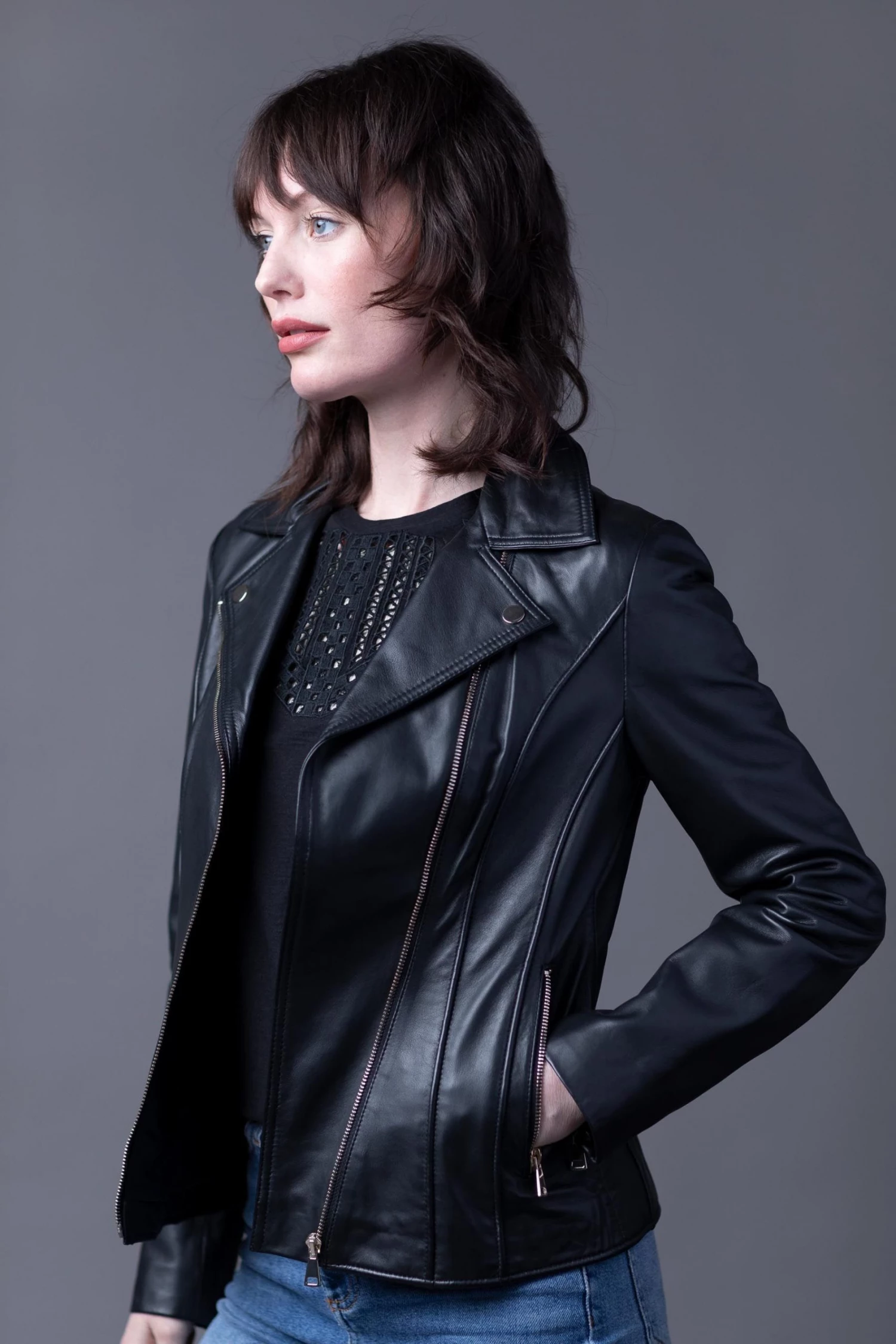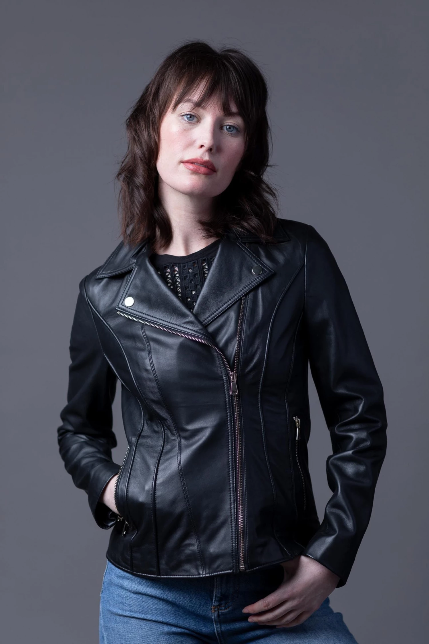 Crafted from UK sourced aniline leather, the Kylee leather biker jacket in black is a premium piece of outerwear with a classic aesthetic. Featuring details which are synonymous to the classic biker design, the asymmetrical zip closure, tonal hardware and lapels, Kylee is a jacket you’ll never want to take off. Style this iconic design with your favourite jeans or over a floaty dress for a casual, chic look. The slightly longer length allows it to be worn every season and will look great on women of all ages.
