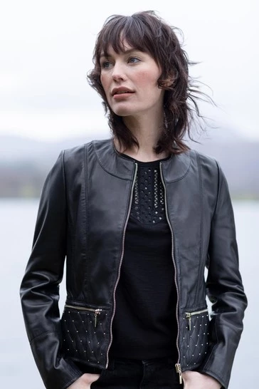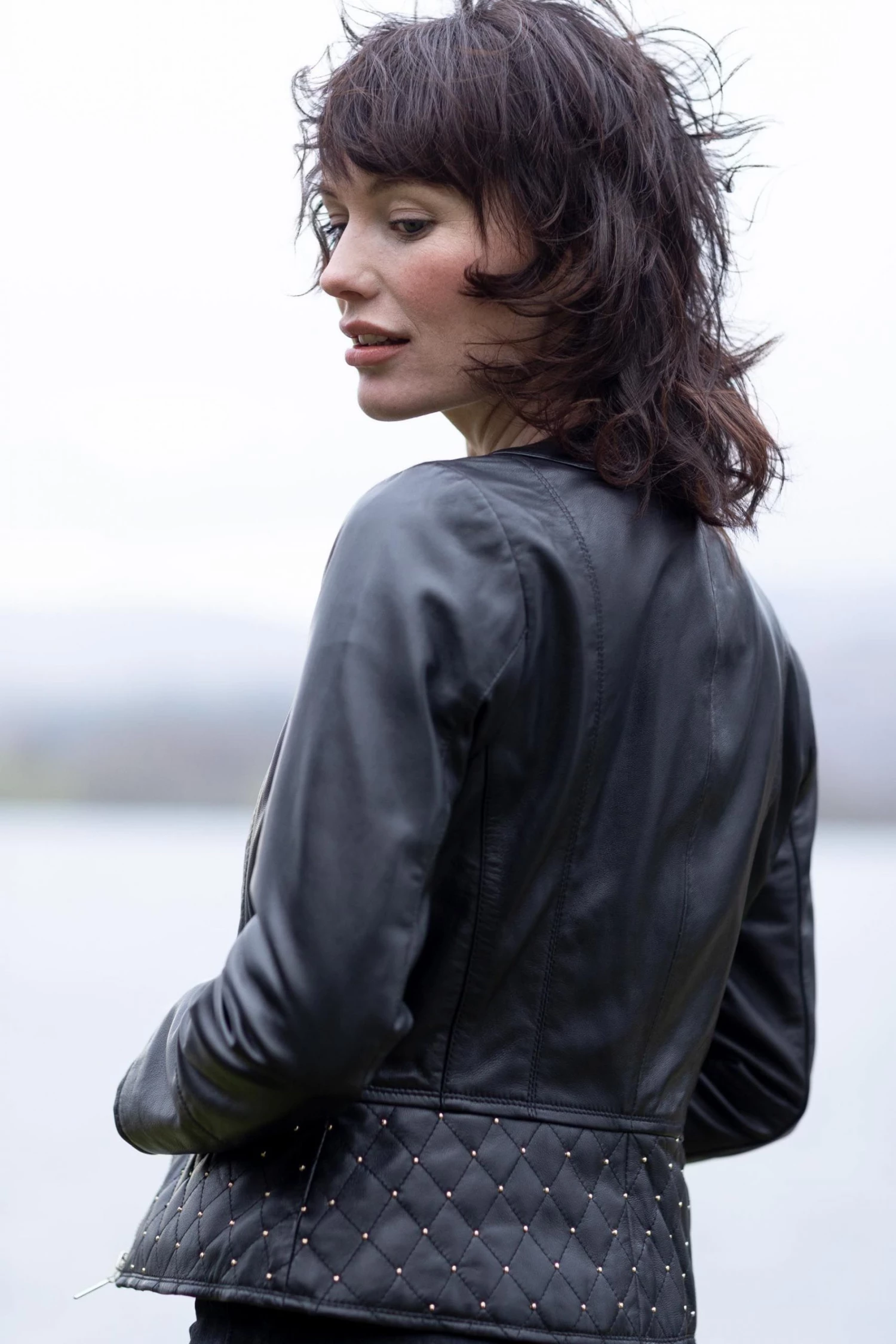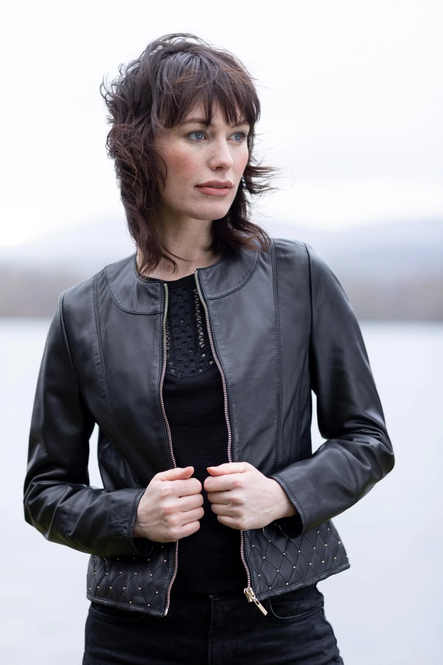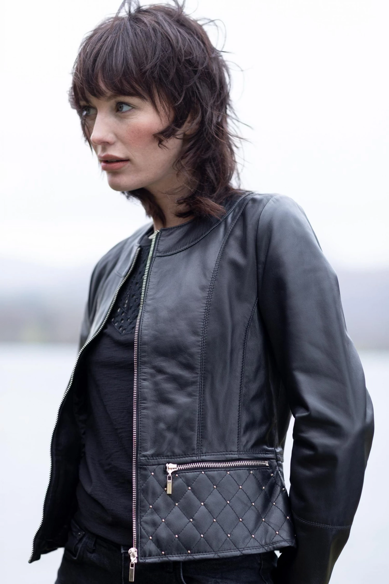 The Motherby leather jacket in black is sure to add a touch of glam to your outerwear collection. Expertly crafted from soft touch aniline leather for a jacket that will be worn year after year. The quilted style on the bottom third of the jacket with gold-tone studs adds a touch of pizzazz to a contemporary style jacket. The leather panelling and collarless design make for a flattering fit that can be worn as a casual piece in the daytime or to dress up in the evening.