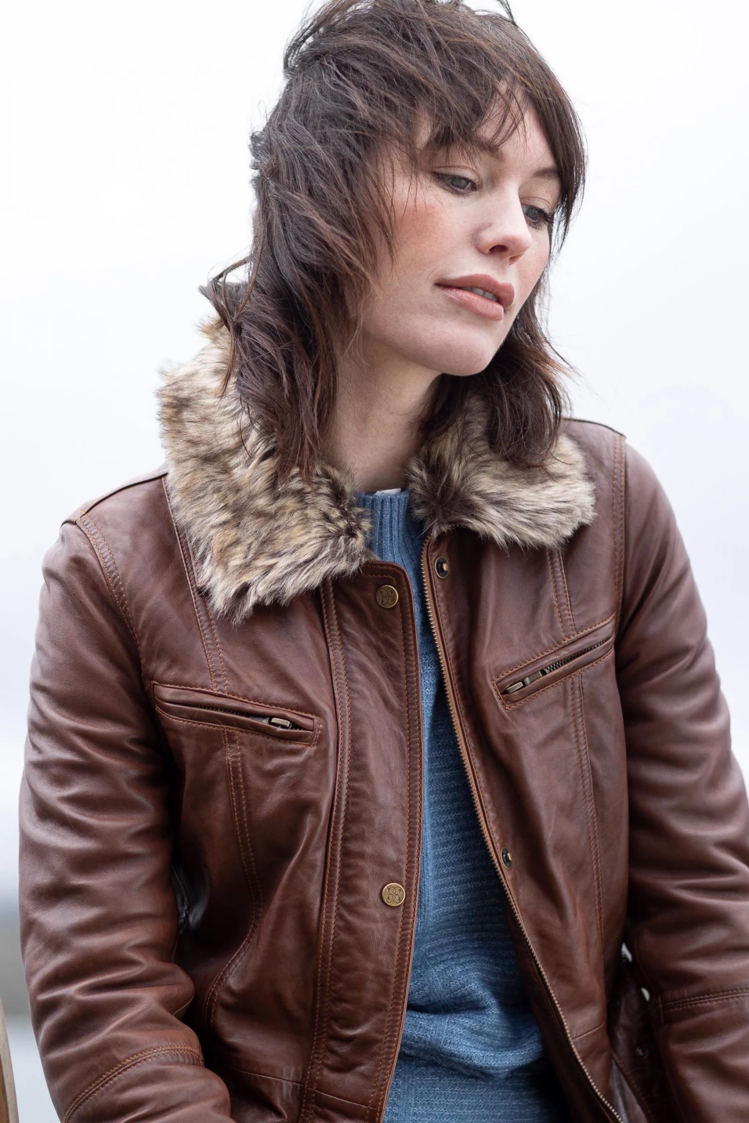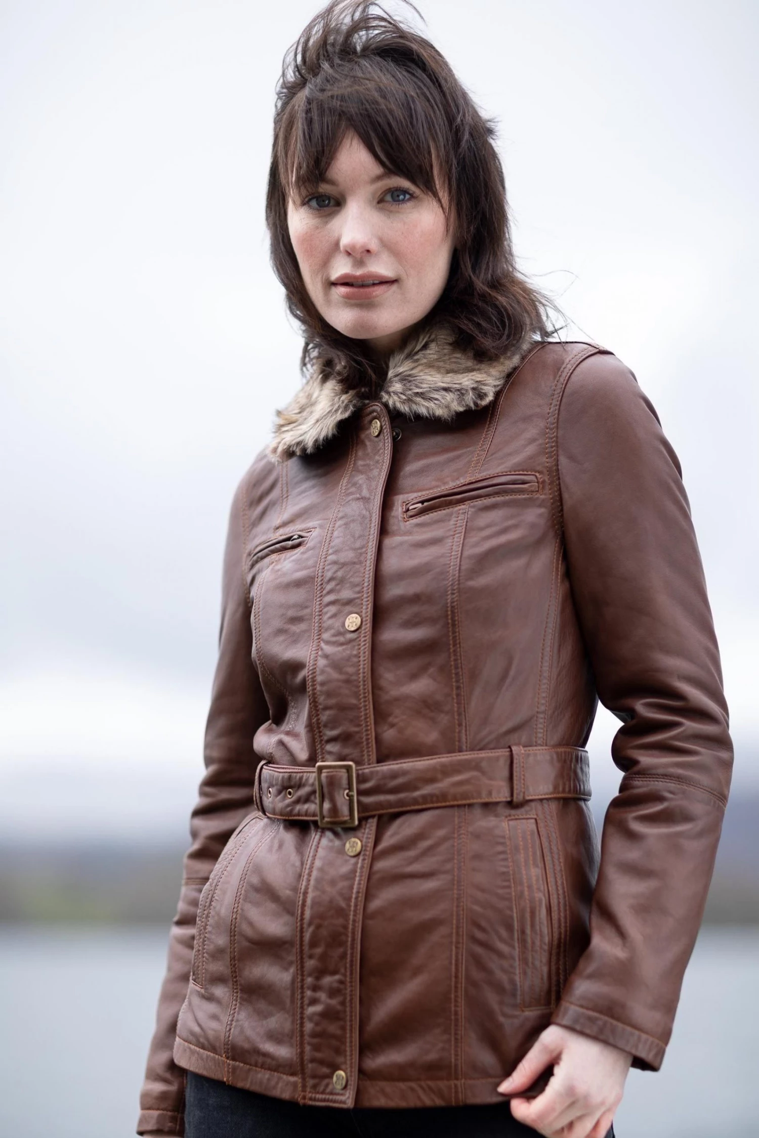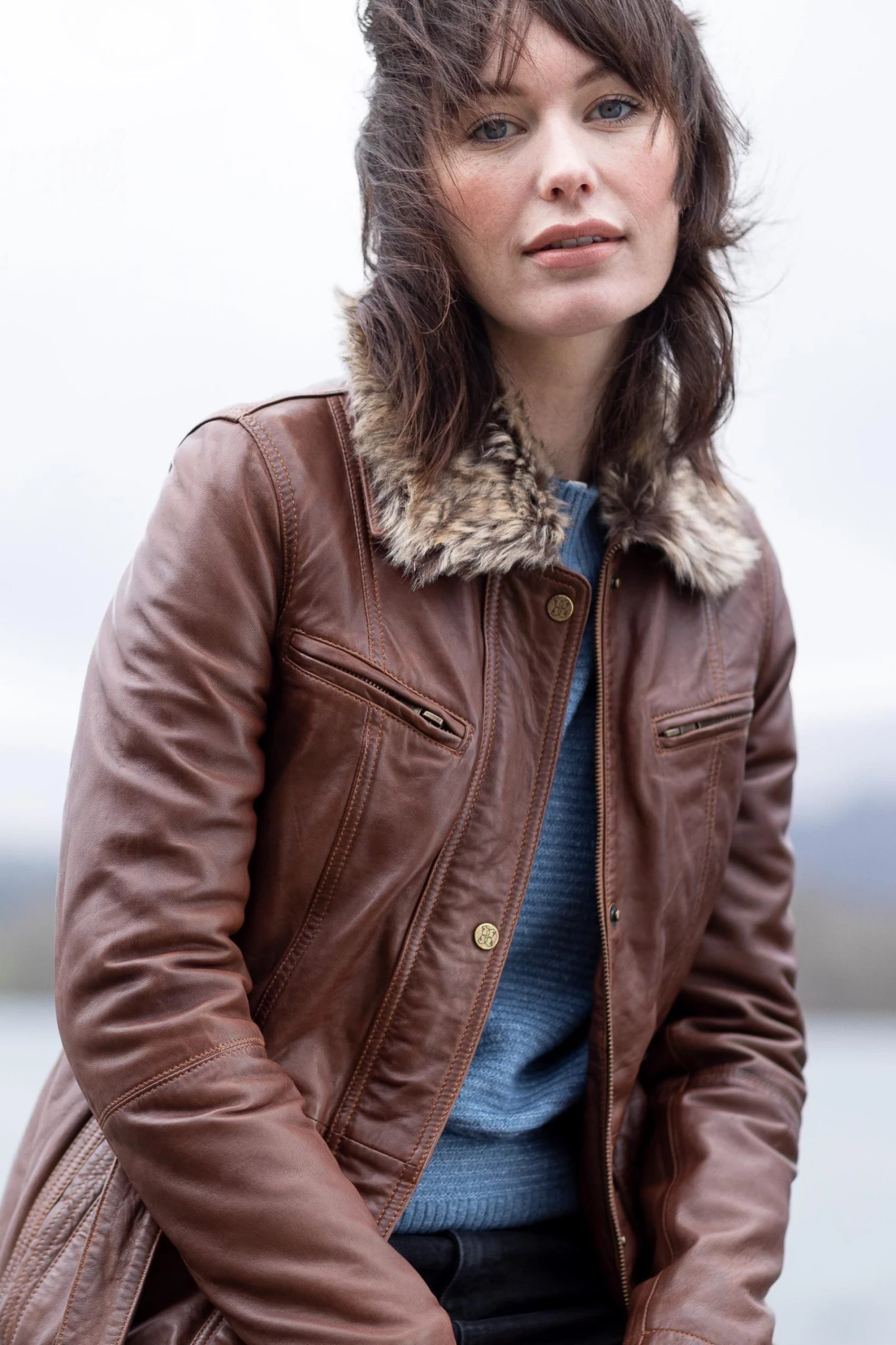 Crafted using the finest UK sourced aniline leather, the Tirril coat in tan is the perfect addition for your outerwear collection this season. The Tirril presents a sumptuously soft jacket with a luxury feel and presence. Crafted at a slightly longer length design to keep you warm this season, the Tirril features a gorgeous detachable faux fur collar, tonal hardware, a hidden zip and press stud fastening plus a belted waistline to enhance your figure. A timeless coat that has a lasting style, it will be your go-to for all occasions.