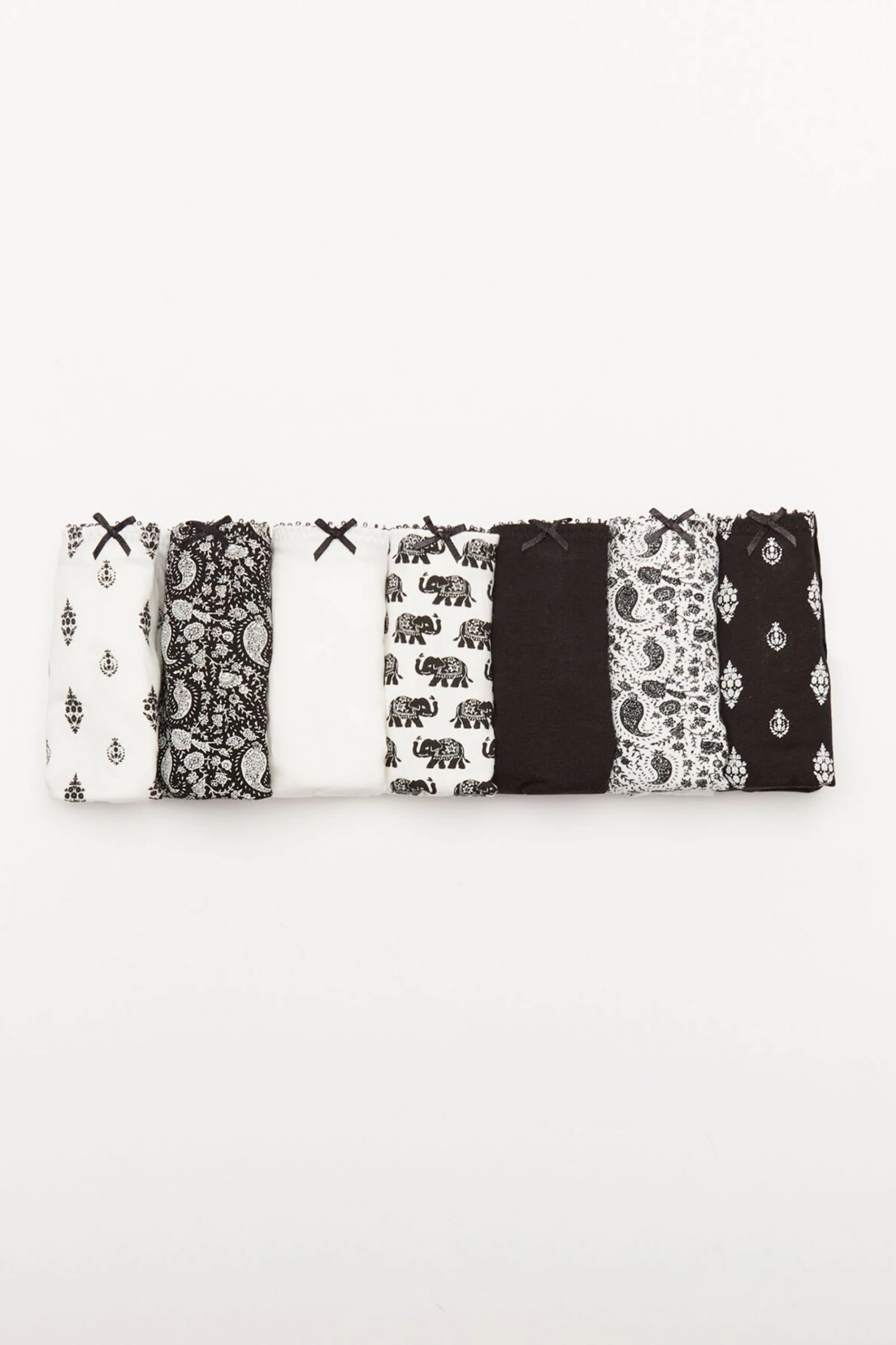 Get this pack of seven classic cotton hipster panties, and add an extra special look to your sets. One for every day of the week and they’re all ideal! In muted yellow with black contrast details and a little bow, they’re an underwear drawer essential. Add some variety to your everyday looks with an Indian-inspired print.