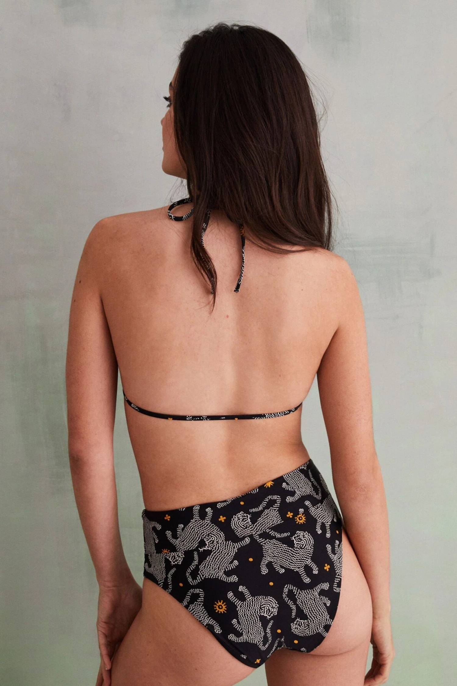 Ideal, right? Enjoy fun in the sun with this reversible curtain-style triangle bikini top in fail-safe black. With a bow at the neck and tie details on the front. In a white off black style with African inspiration, it features a mustard-colour tiger print. Strut your stuff on the beach or in the sun.