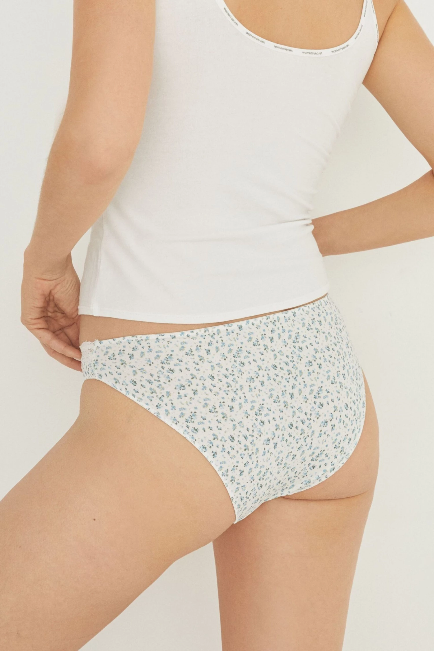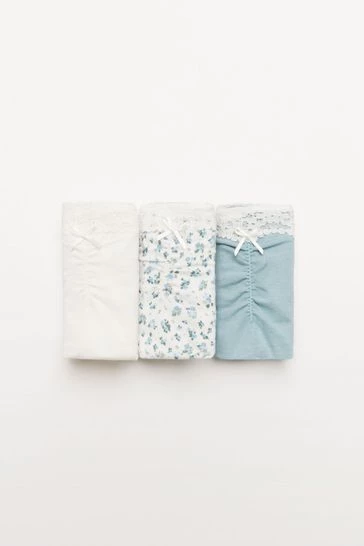 Pack of three classic hipster panties with cotton and lace trim details. In blue with a floral print, the little front bow gives them an extra dose of romance. An absolute must-have for your underwear drawer.