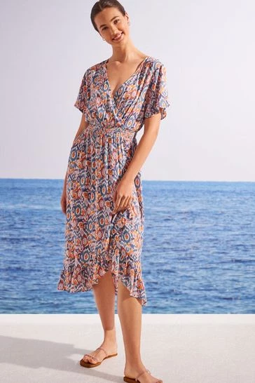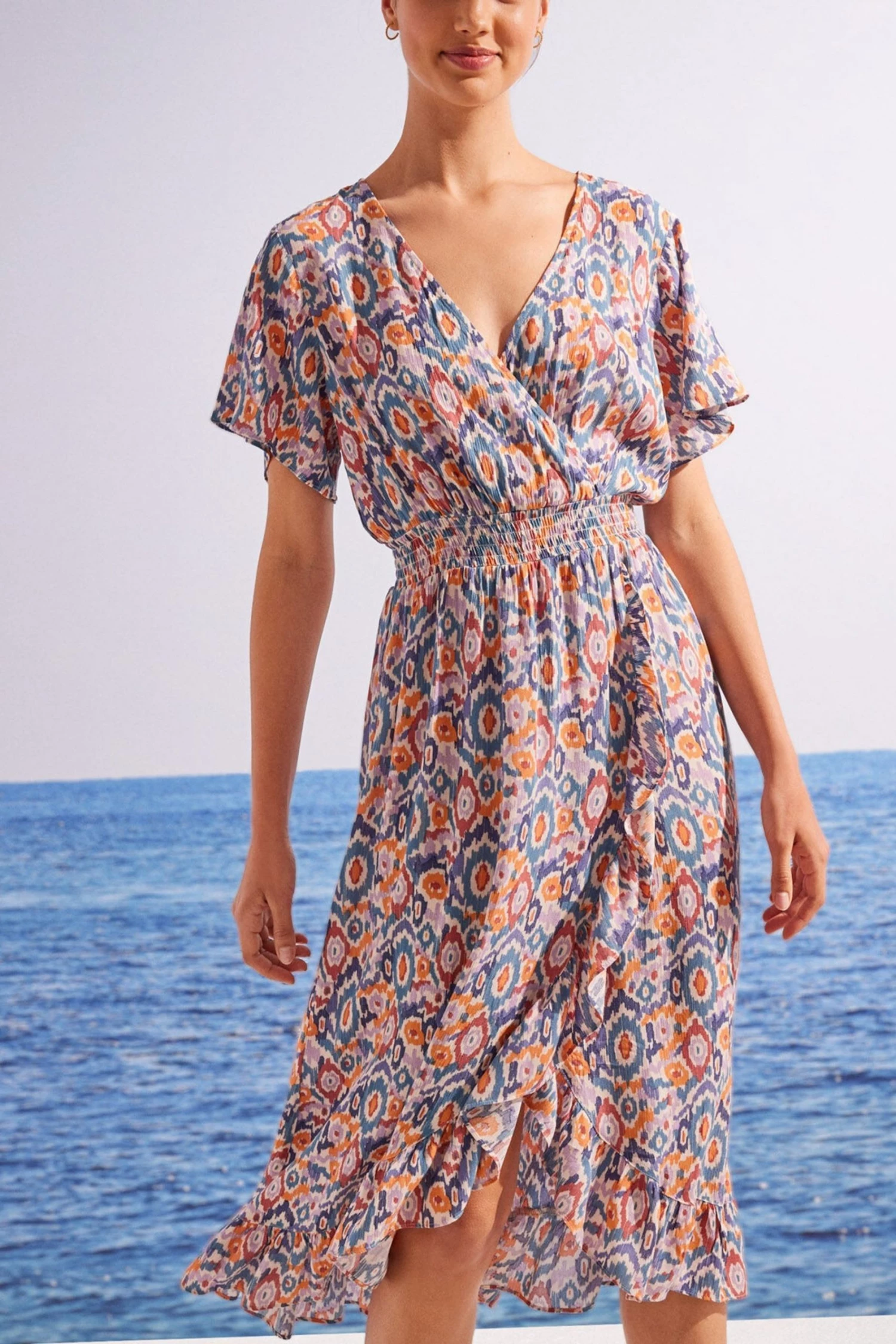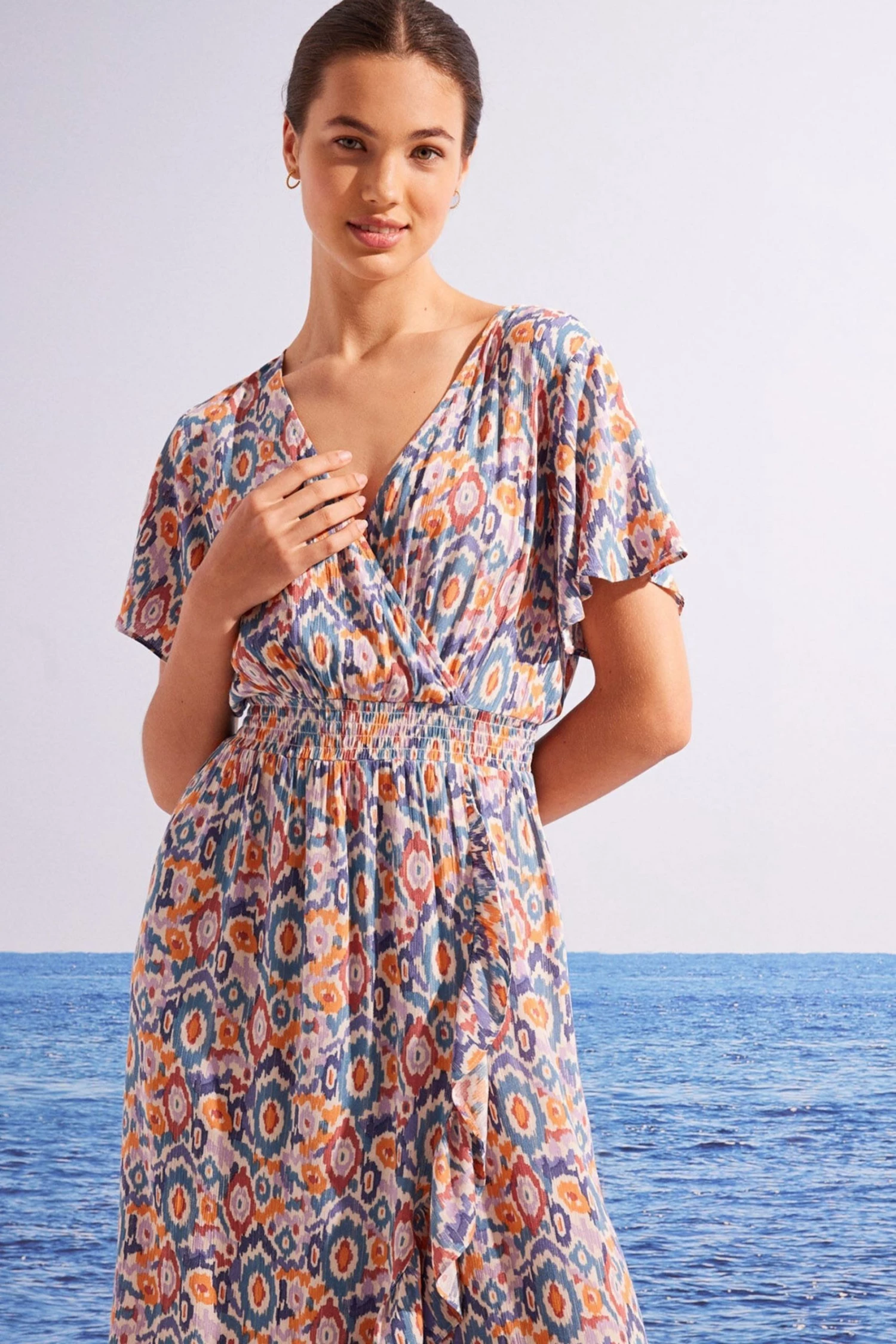 Ethnic print midi dress with short flounced sleeves and a V-neck. It also has a slit detail at the front with ruffles, giving it that original and sexy look that you’re sure to love. It features and elasticated waist for a better fit. The perfect choice for a warm day.