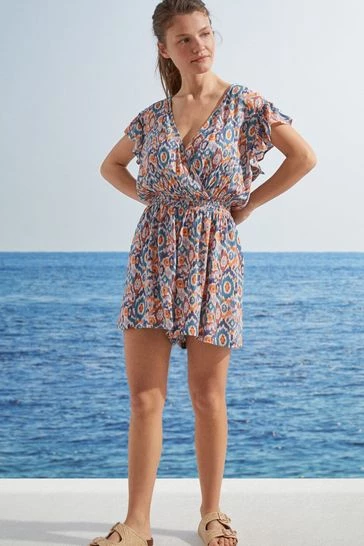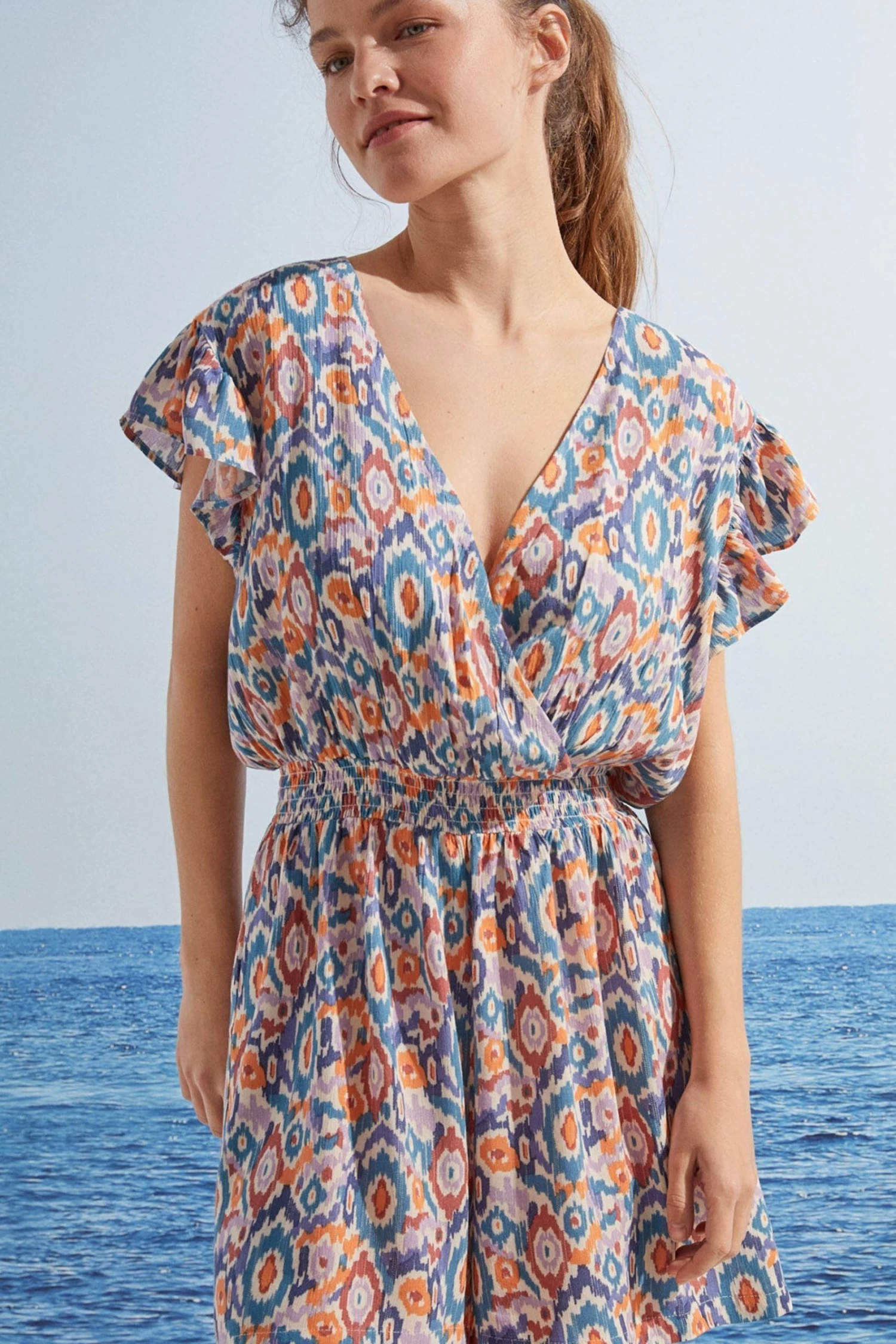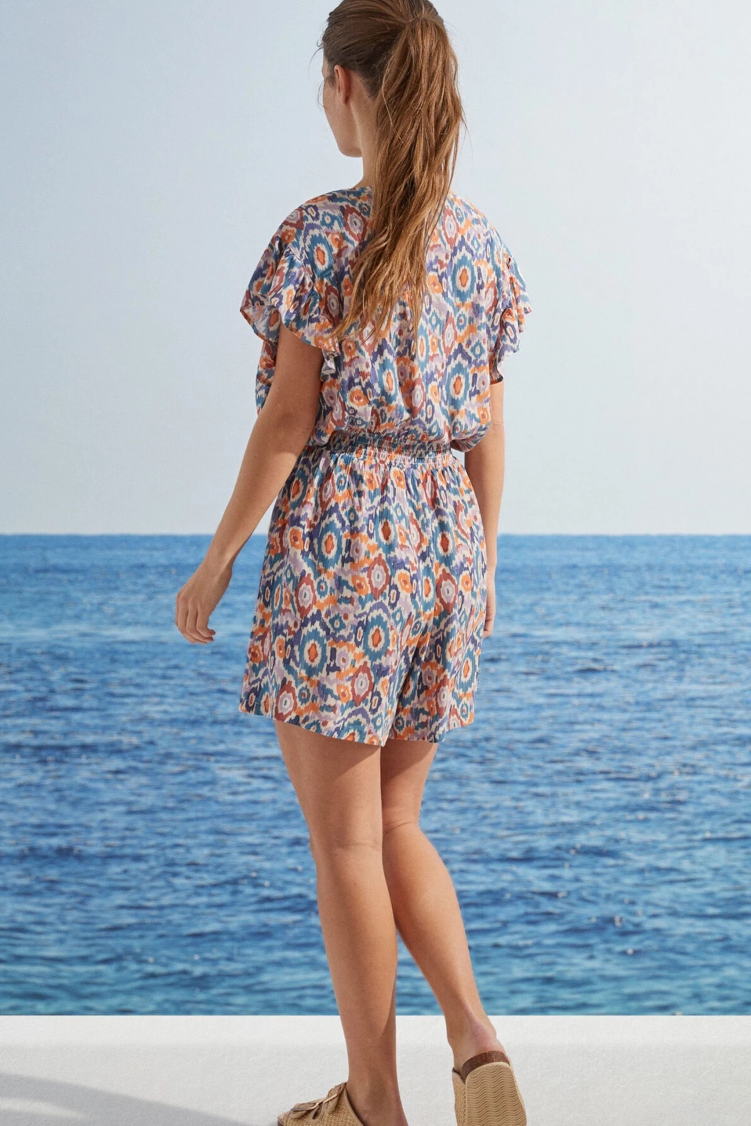 V-neck playsuit with short fluid sleeves with ruffles in an original, super trendy ethnic print. It also has an elasticated waistband for a better fit. The perfect choice for a warm day. Combine it with any accessories for a seriously hot look!