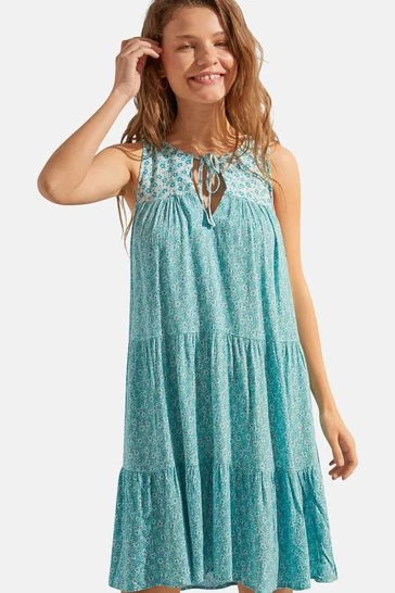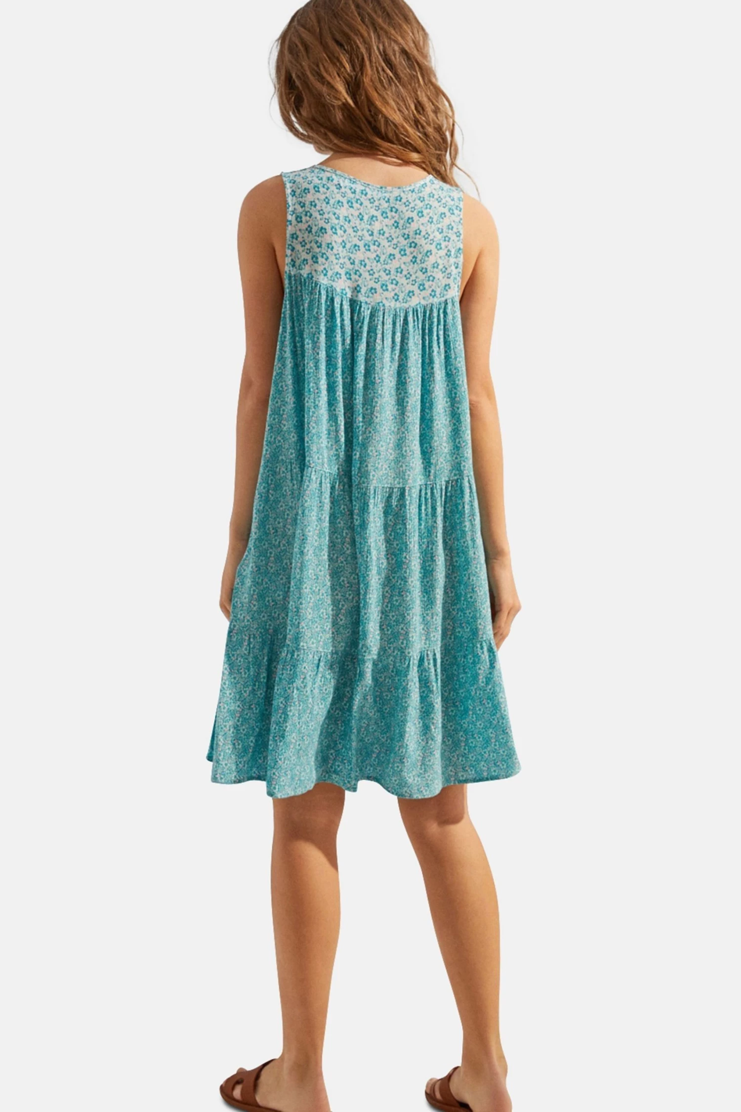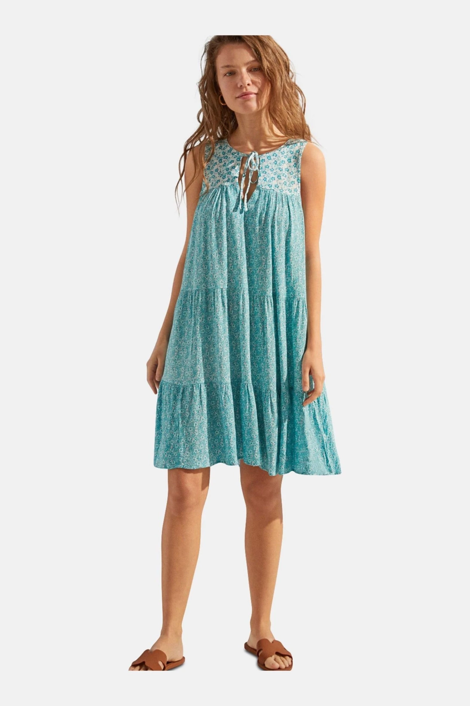 Strappy dress with flounced panels and a turquoise floral print. It also has a V-neck with cord detail for a touch of originality.