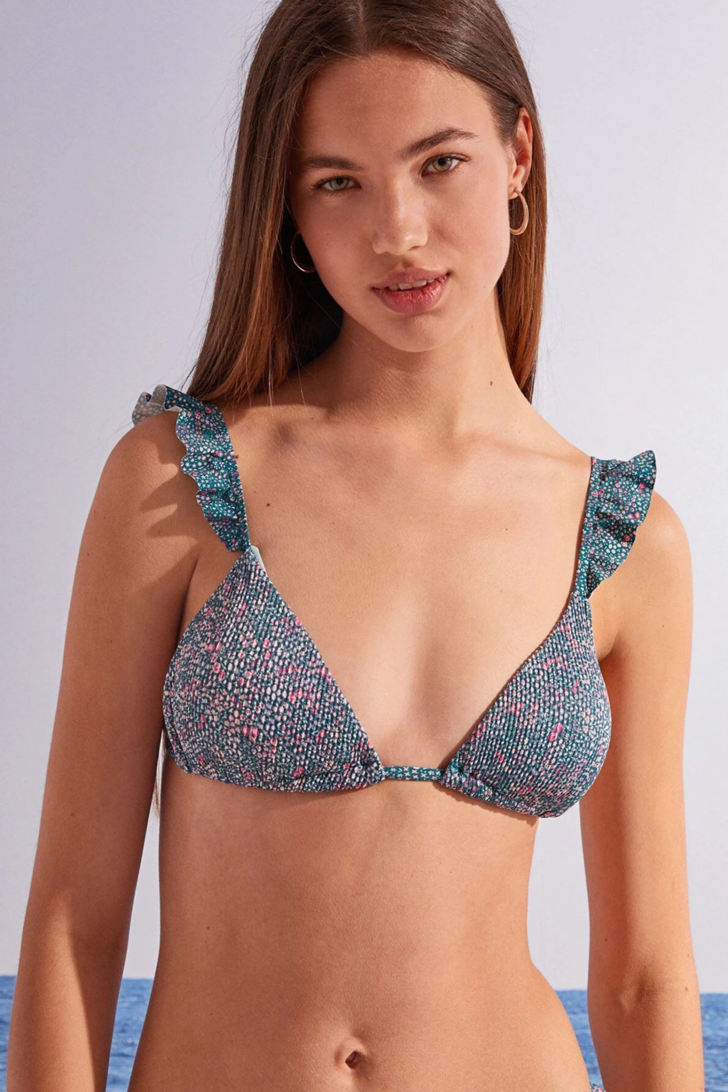 Ribbed triangle bikini top with floral print. With adjustable straps with flounced detail, this bikini top is an absolute must for this season. Plus, it has removable cups so you can wear it however you like. Combine this bikini top with bottoms, along with any accessories, to create the ideal beach or pool look!
