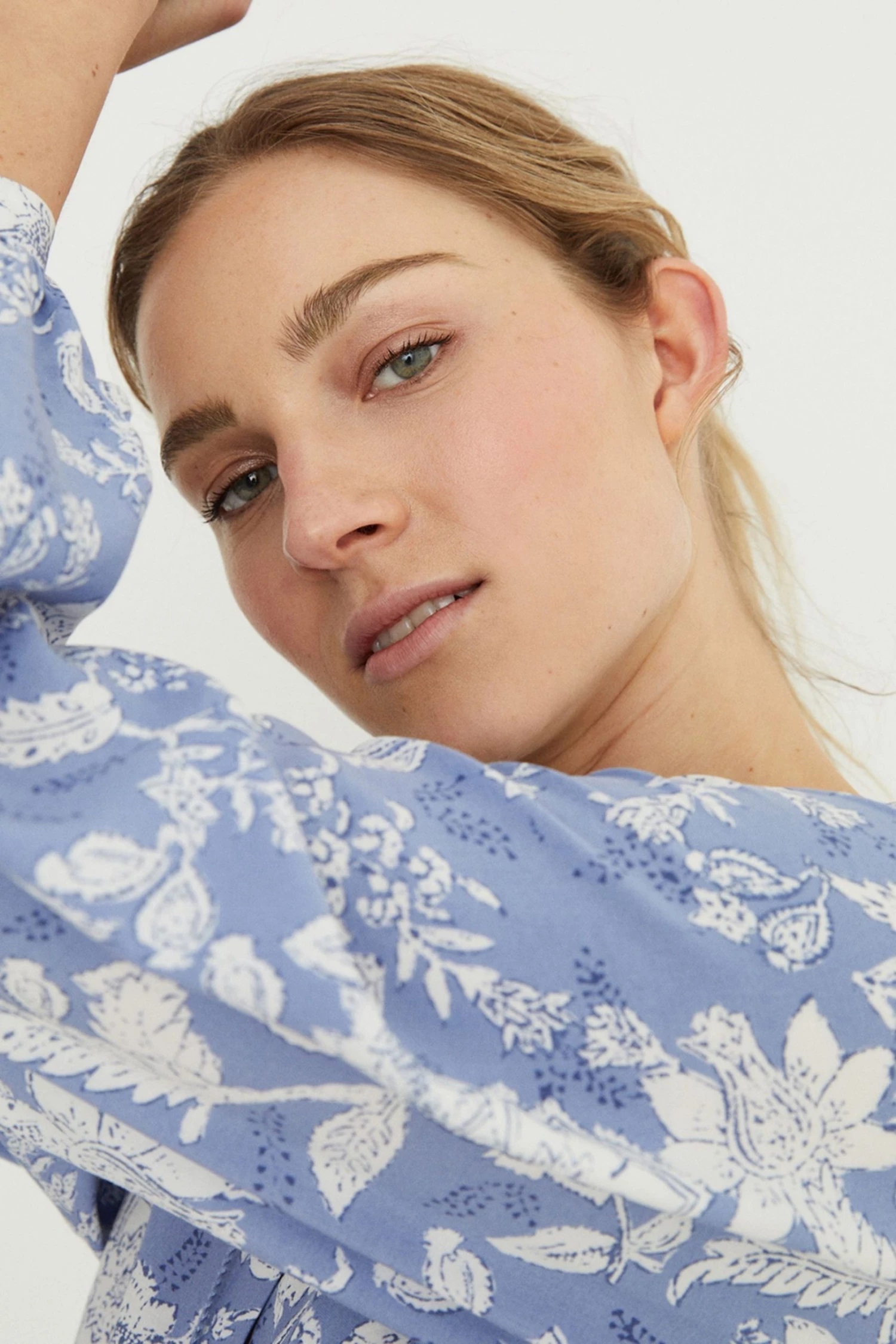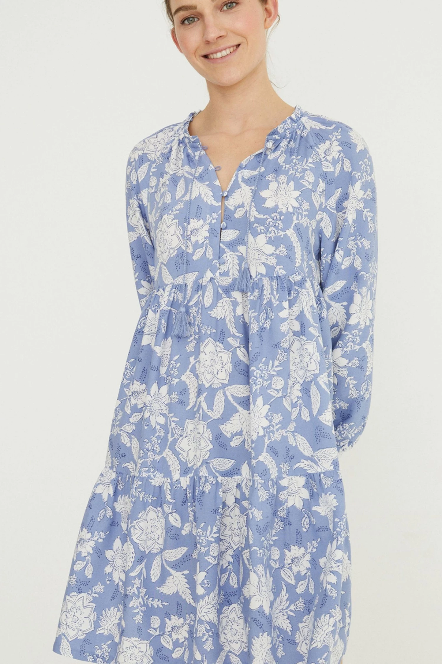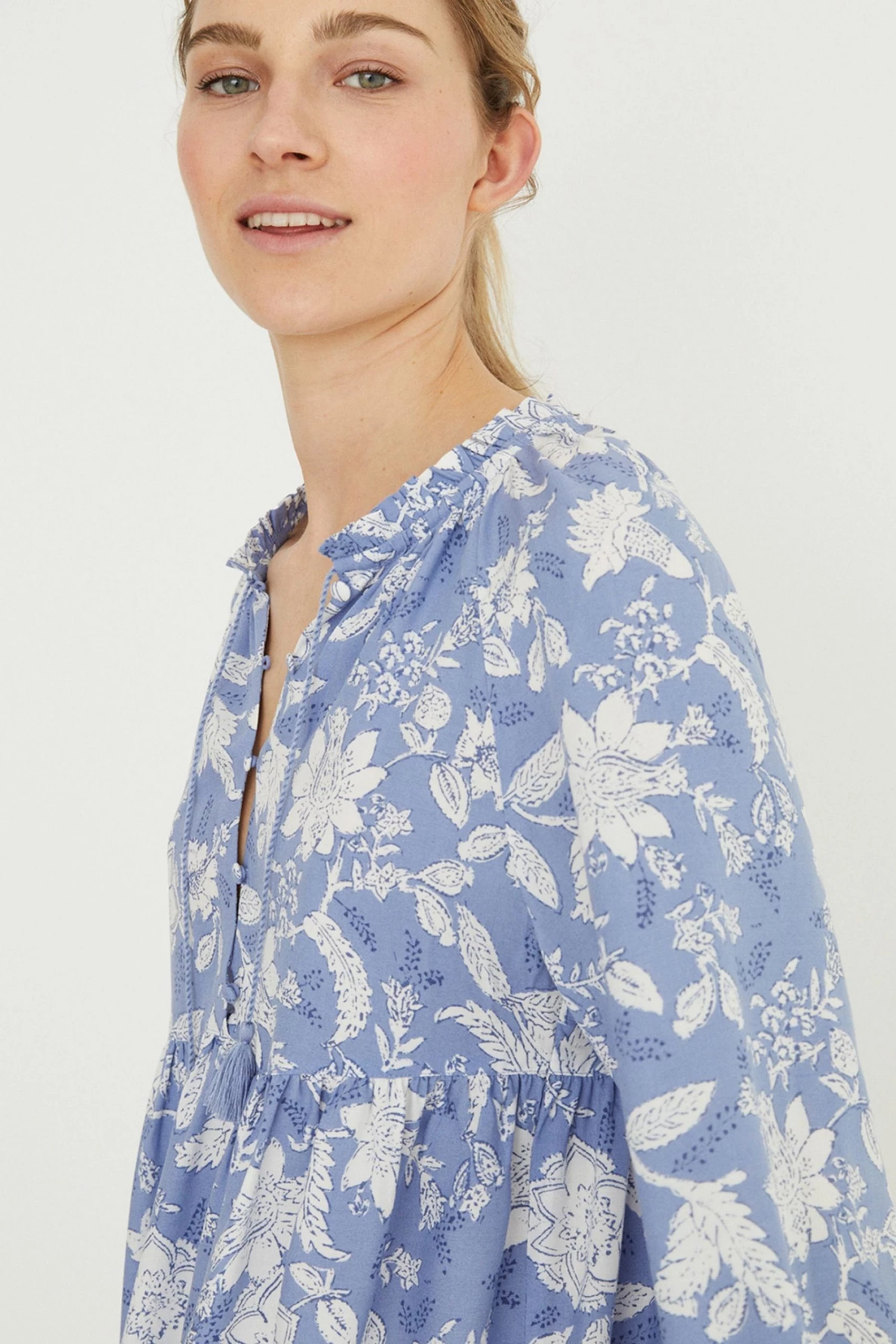 Printed blue tunic dress with original 3/4th raglan sleeves. Round neckline with opening, self-fabric covered buttons and cotton tie with tassels. Gathered details at the bodice to add some flare. Ideal for street looks too. Throw on a jacket and you’re all set!
