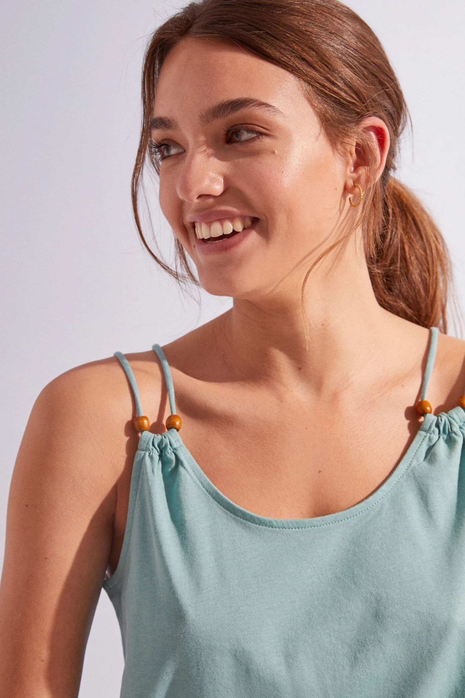 Pyjamas with short bottoms and vest top, in blue 100% cotton. Round neck top with beaded cord straps, for an extra original look. Short printed bottoms with comfy elasticated waistband and cotton tie with tassel detail.