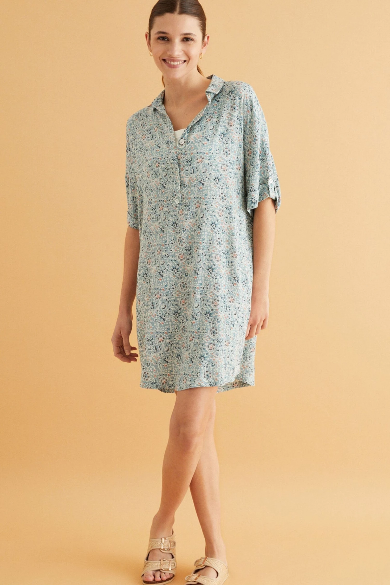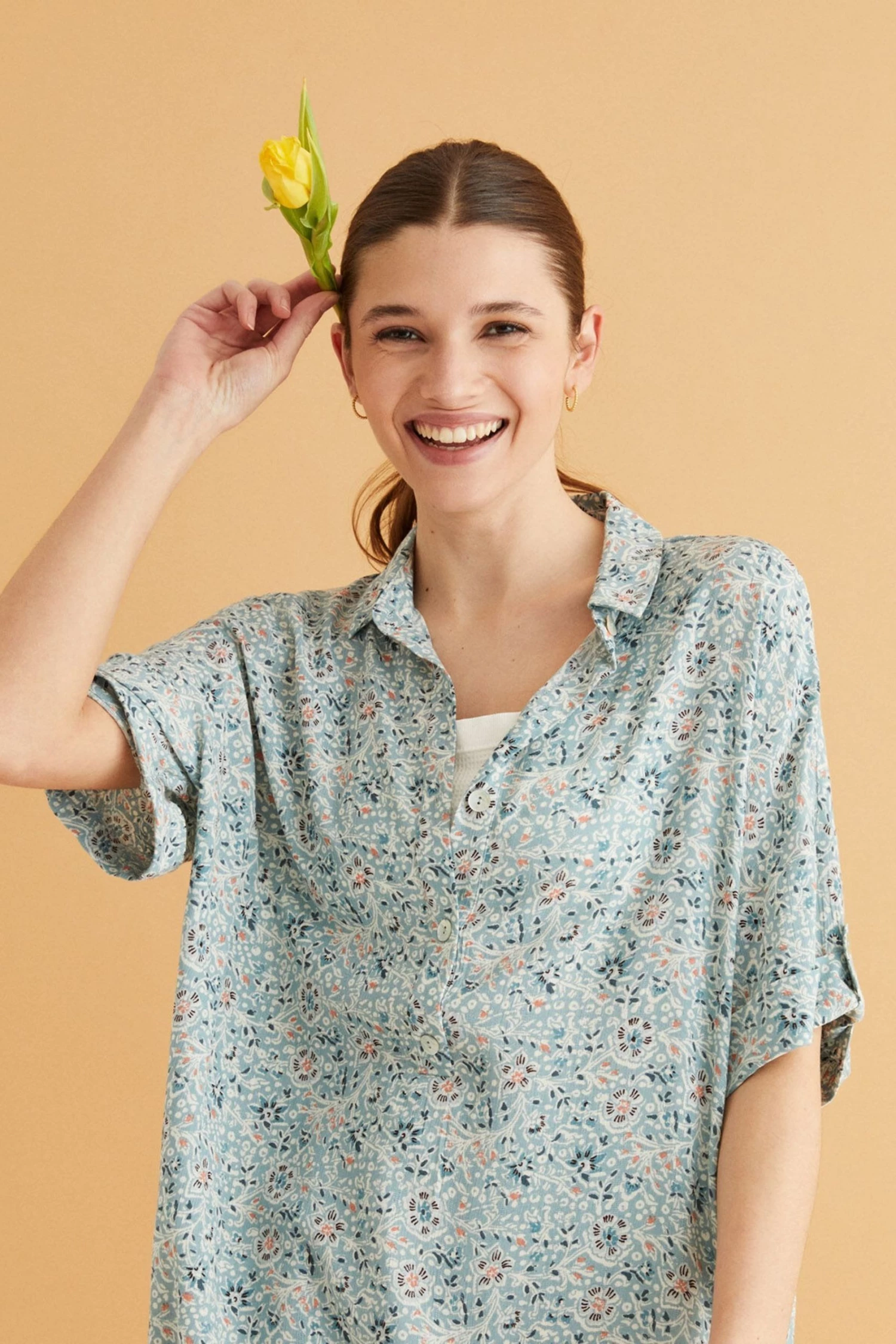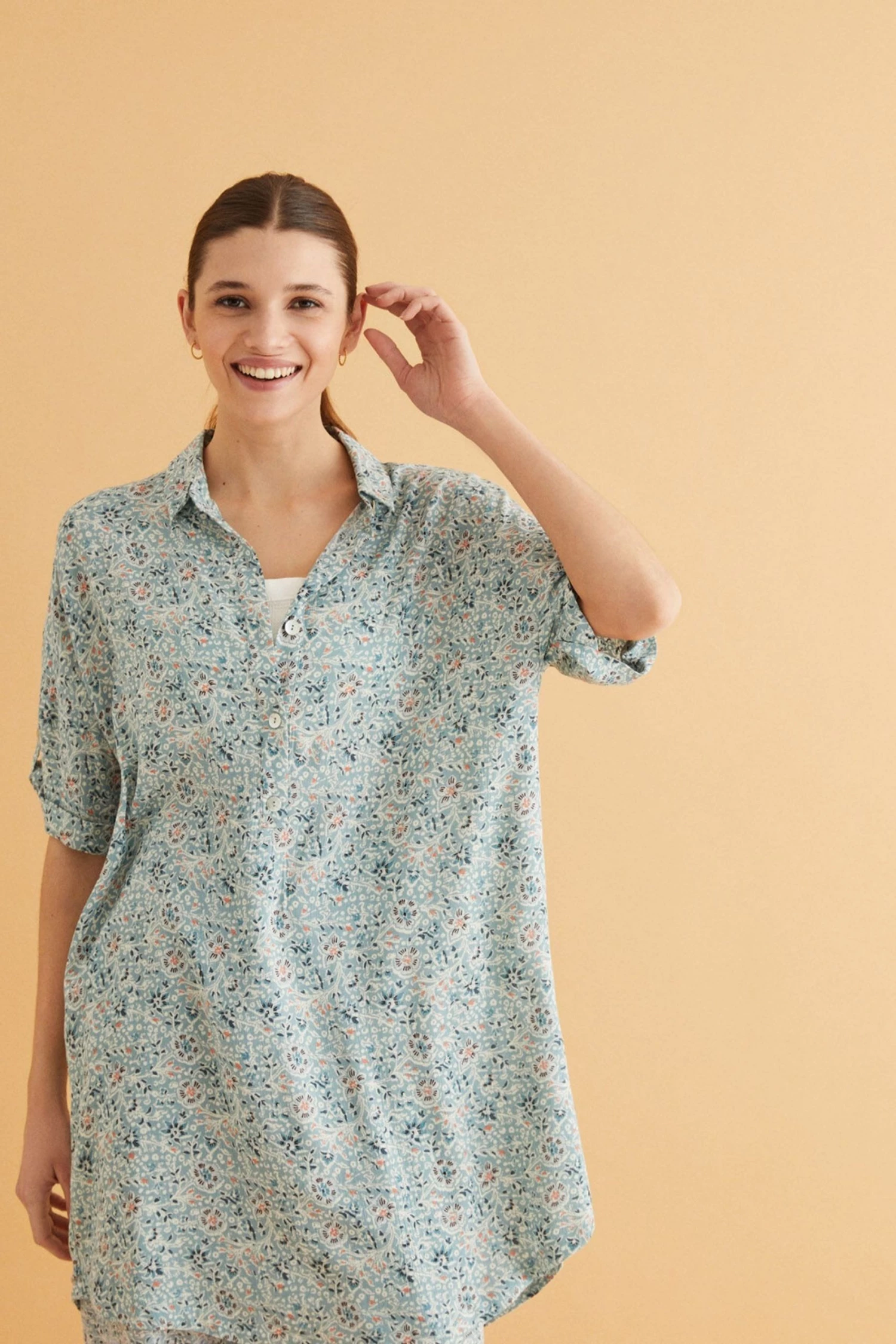 Ideal, right? A comfy and feminine short camisole in flattering blue. Made in textured 100% viscose, it feels gorgeous, soft and fresh on spring days. With a shirt collar, the camisole has a safari vibe, with Indian-inspired adjustable 3/4 sleeves. Spend your days in this comfy and relaxed camisole with a flattering drop, and stay feminine. Perfect for cosying up at home, day or night.