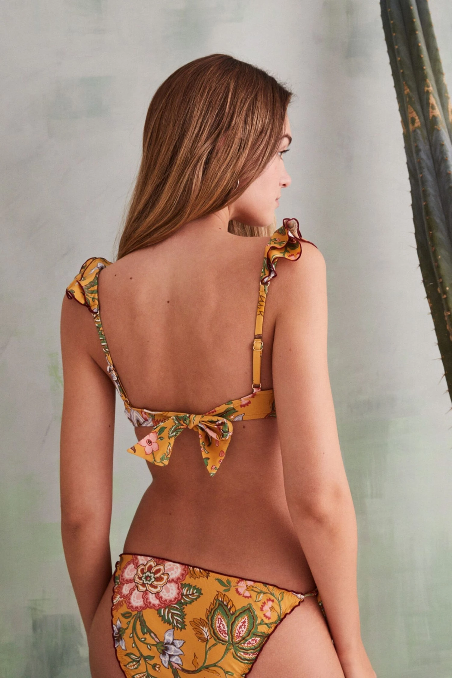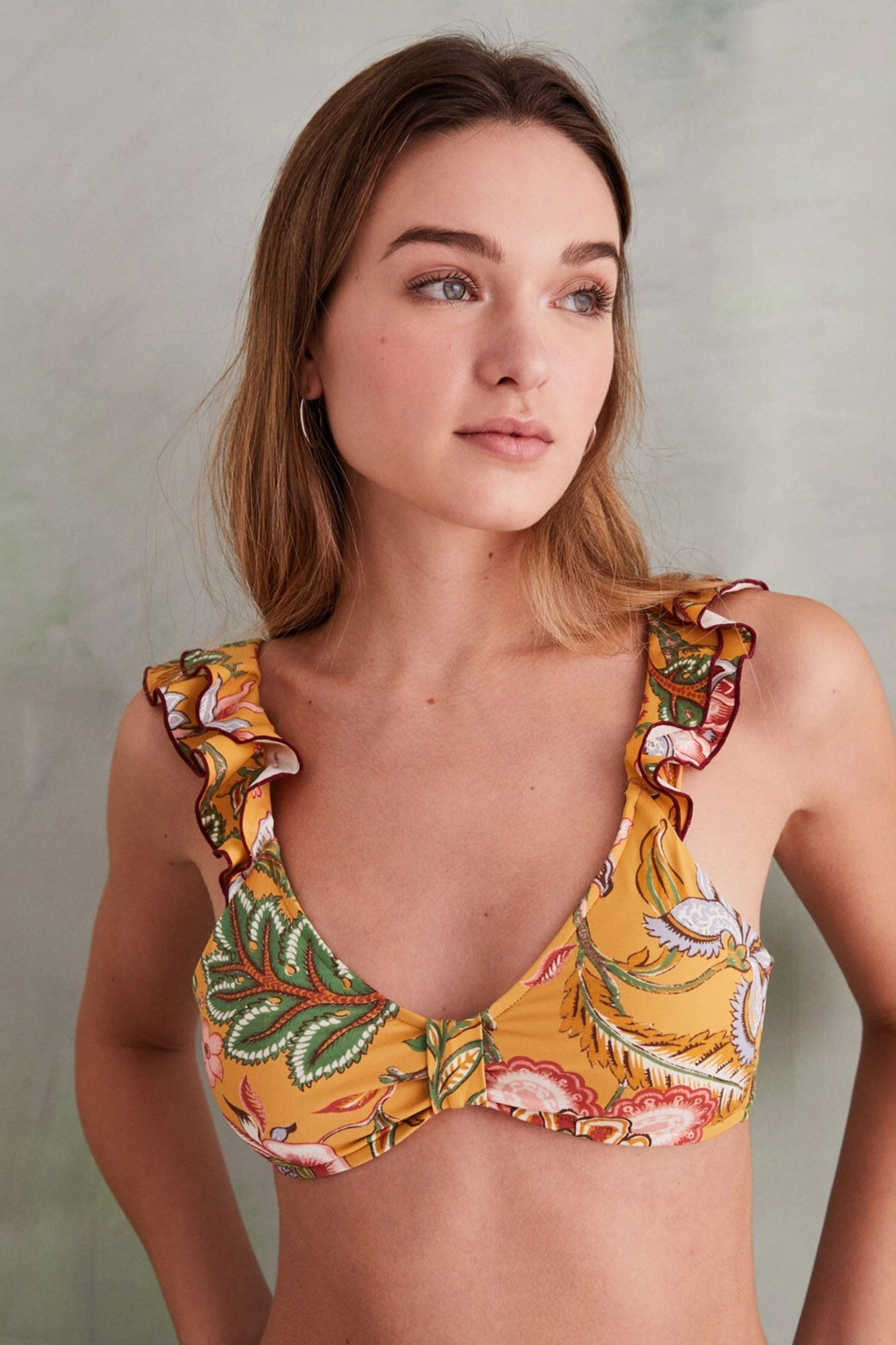 Ideal, right? Enjoy fun in the sun with this gathered bikini top in a gorgeous chocolate colour. With knot-front detail. Featuring an Indian-inspired print, with flowers in shades of pink, claret, maroon and green. Flounced straps with contrast piping in maroon, and adjustable straps hidden below the flounce for added comfort. With removable cups, you can wear it whatever way is comfortable for you. With a tie under the chest that ties at the back.