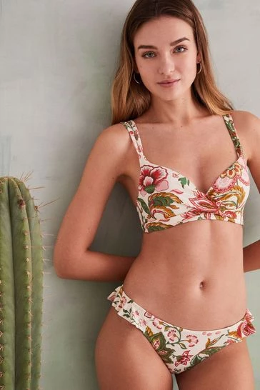 Ideal, right? Enjoy fun in the sun with this underwired bikini top in a gorgeous chocolate colour. Let the push-up design work its magic: natural boosting effect – gain up to one cup size. Try it for yourself? With a back tie, and double straps for added support. Super flattering draped front detail that feels amazing. Featuring an Indian-inspired print, with flowers in shades of pink, claret, maroon and green. Get the perfect piece for your getaway in the sun – the ideal beach or pool look.