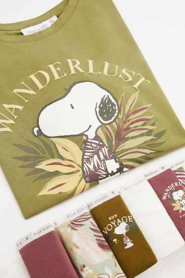 Pack of seven wide-side cotton panties in green and brown. For all-day comfort, seven days a week. Add a fun twist to your underwear drawer with these panties with snoopy details.