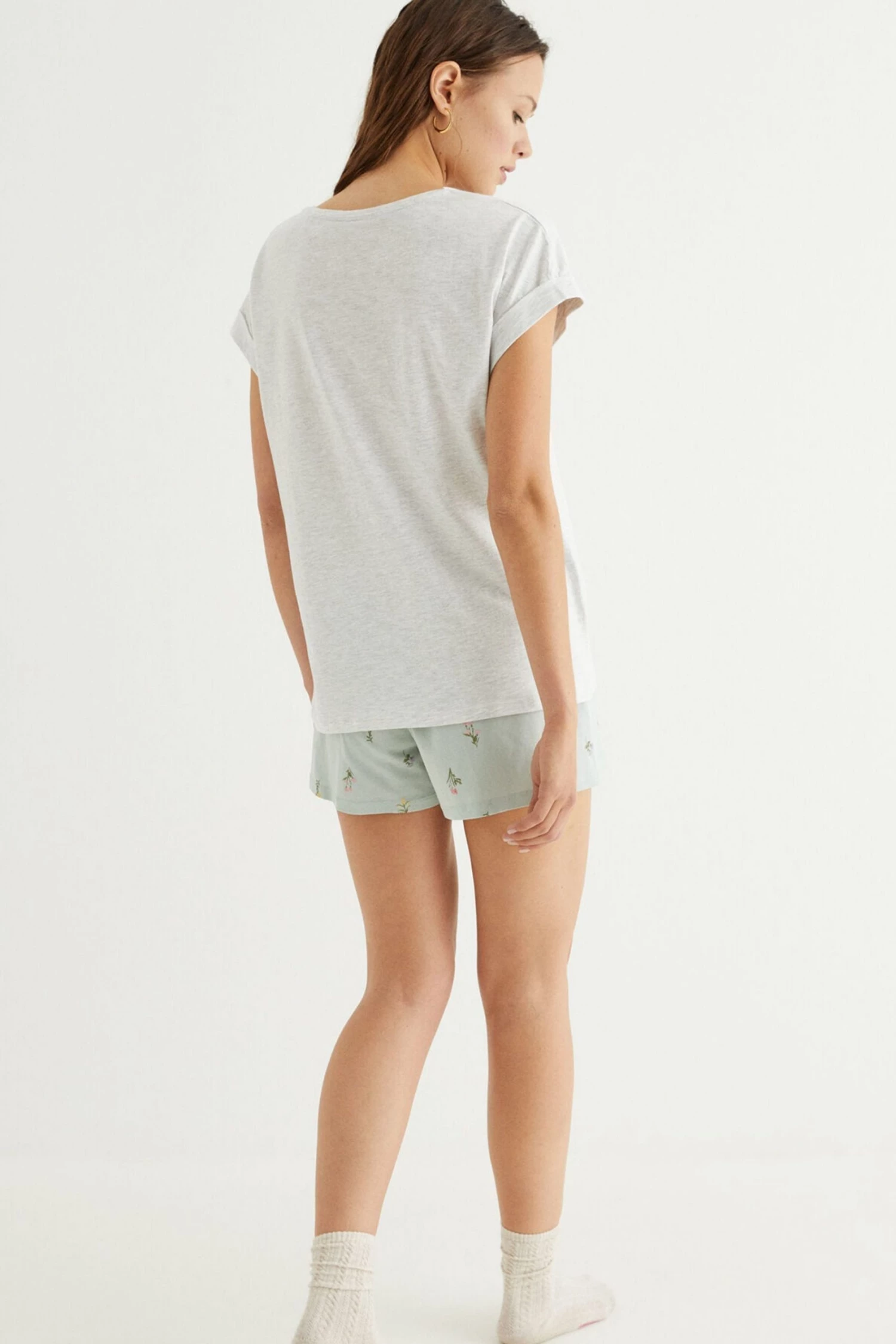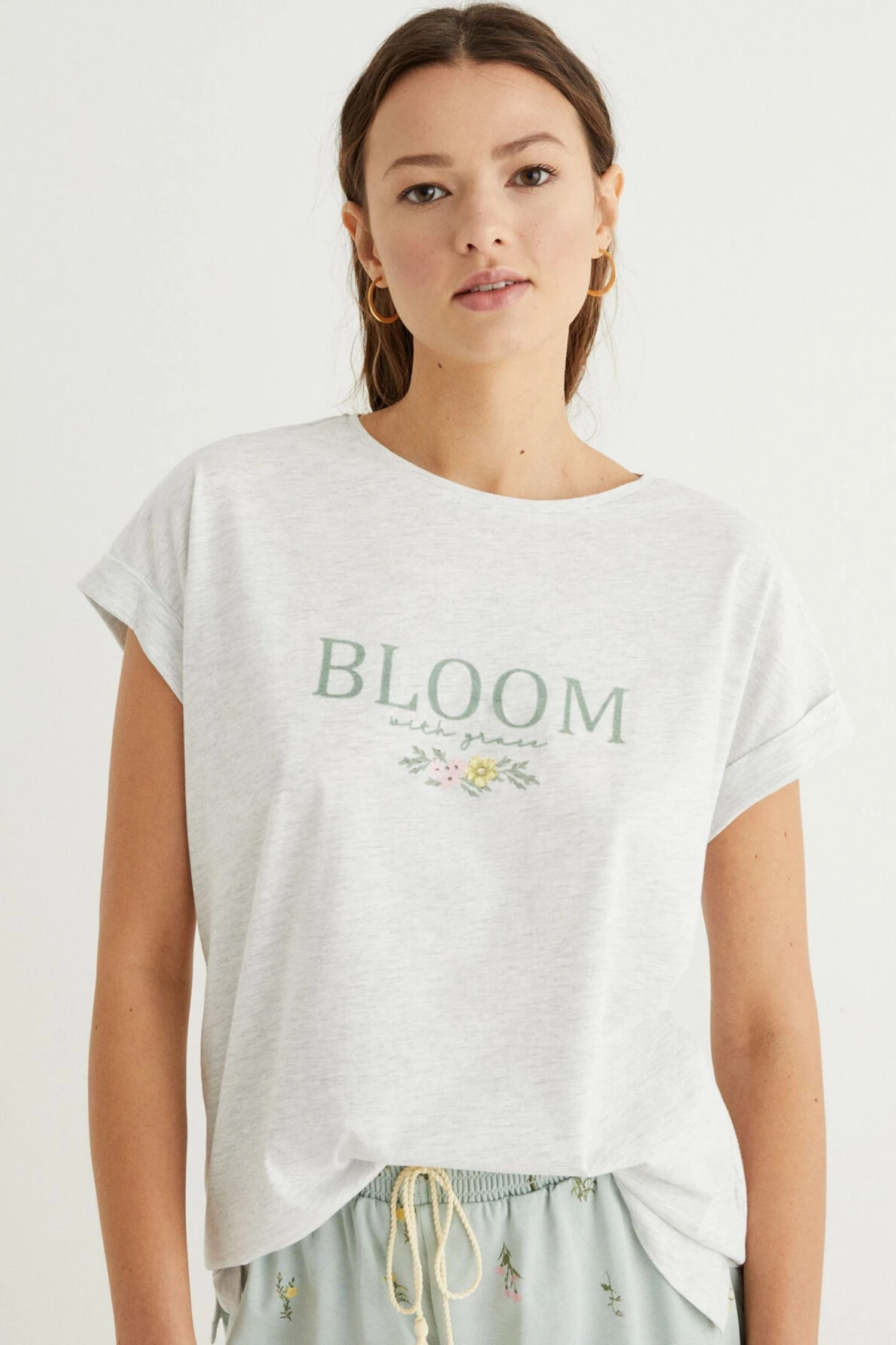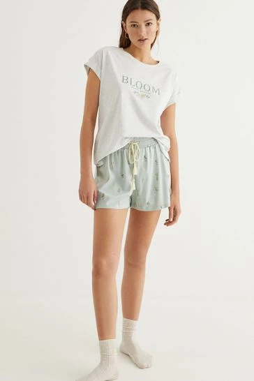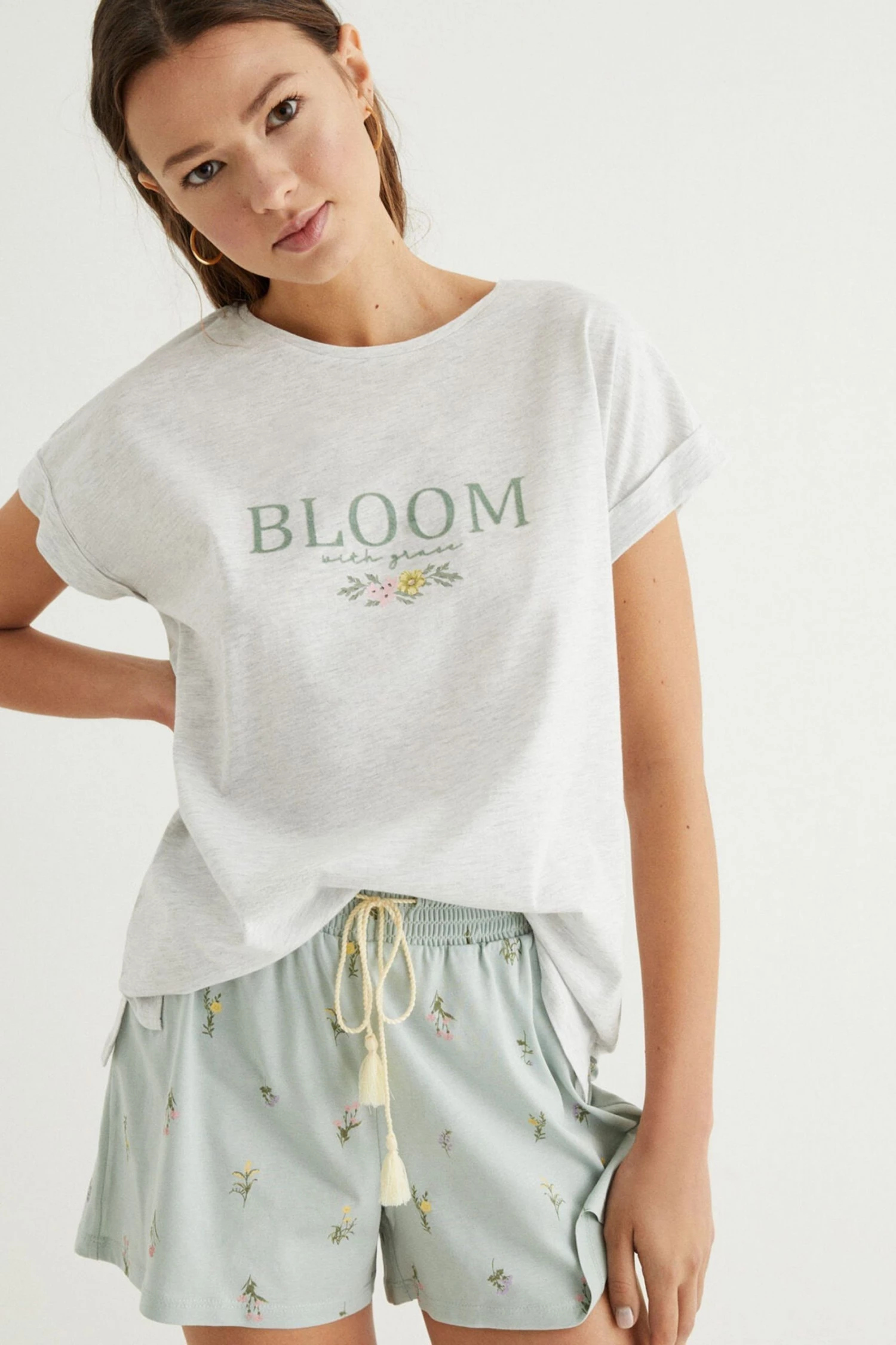 Fill your days with flowers with these short pyjamas with short sleeves, in practical, on-trend grey. The top has roll-up sleeves, a floral print at the chest, and a slogan. The bottoms come in a provençal style print, bursting with flowers. Revel in the scents of spring. With a smocked elasticated waistband for the perfect fit on all figures, and a pompom drawstring.