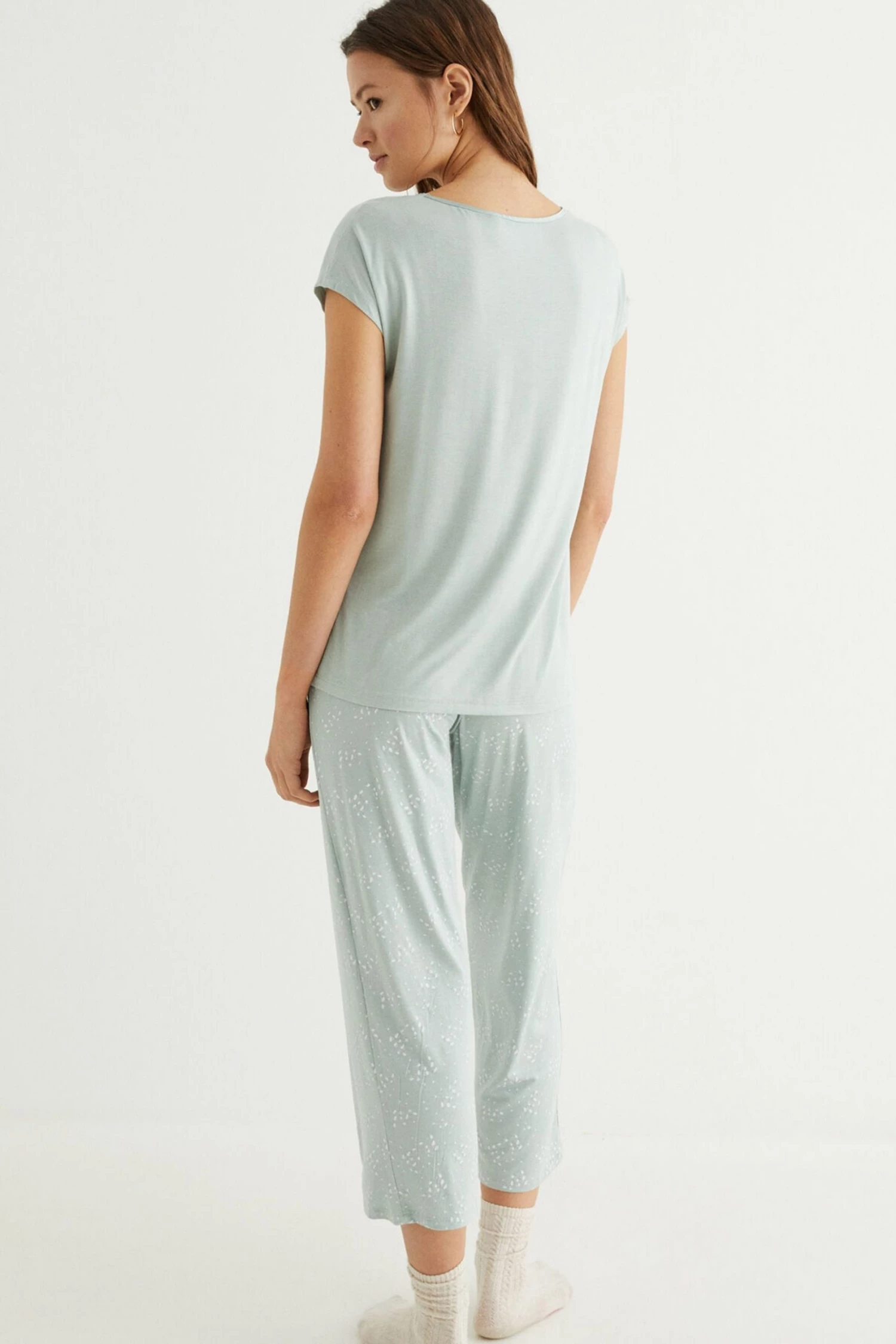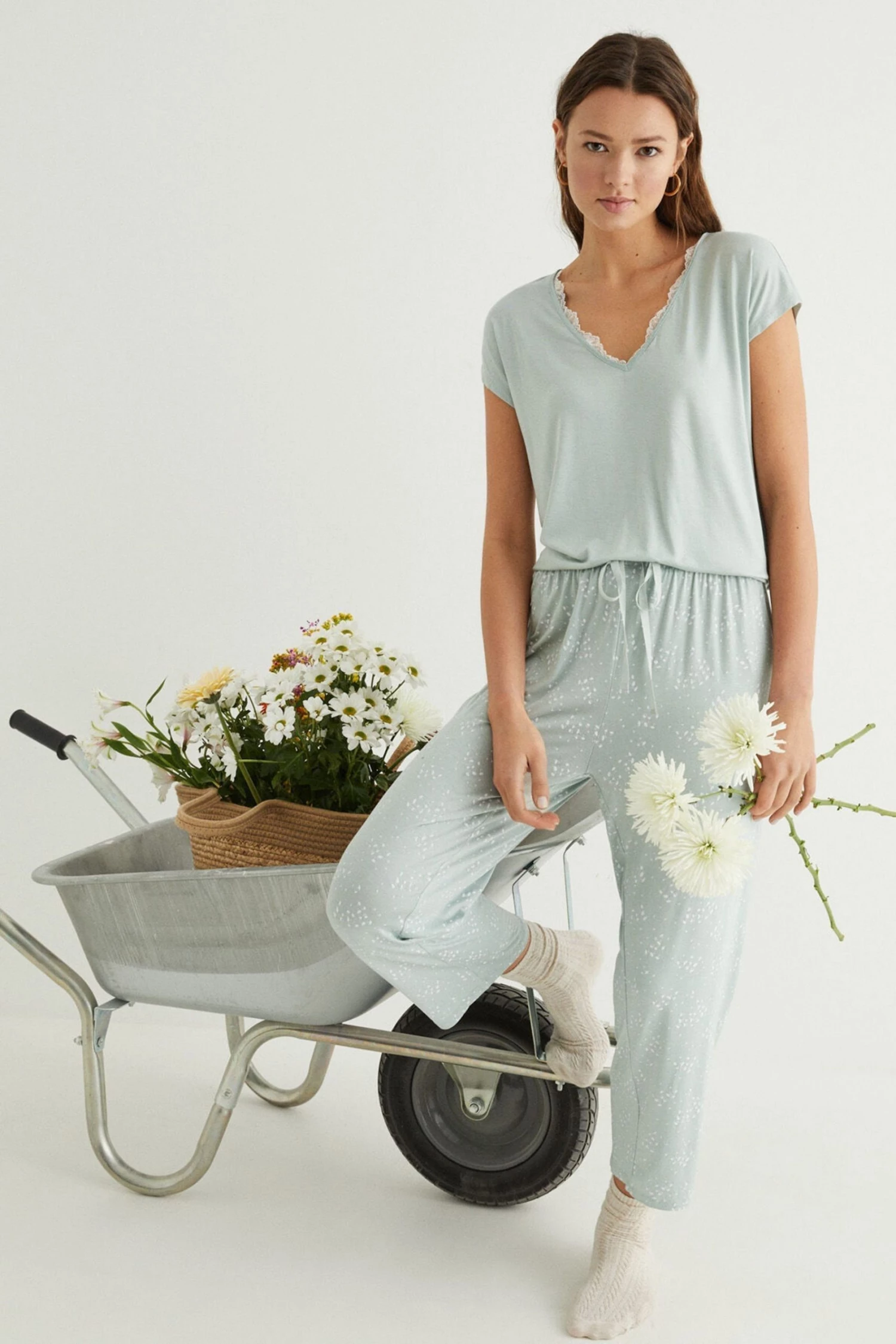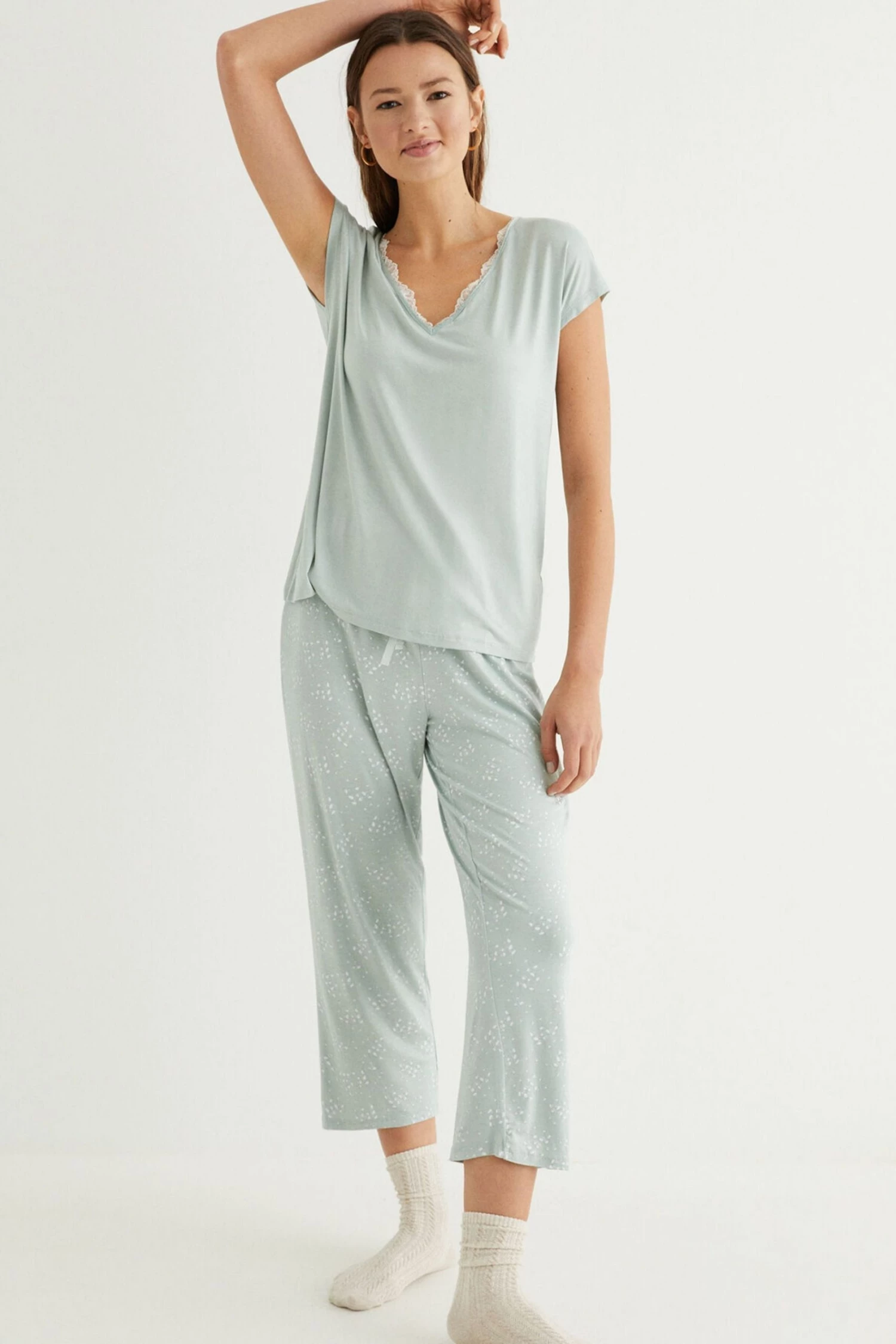 Fill your days with flowers with these long pyjamas with short sleeves, in timeless khaki. With delicate lace at the V-neck. Made in supersoft, comfy and fresh jersey-knit. The floral print bottoms have an elasticated waistband and drawstring for the perfect fit on all figures. Get these pyjamas with a lovely drop.