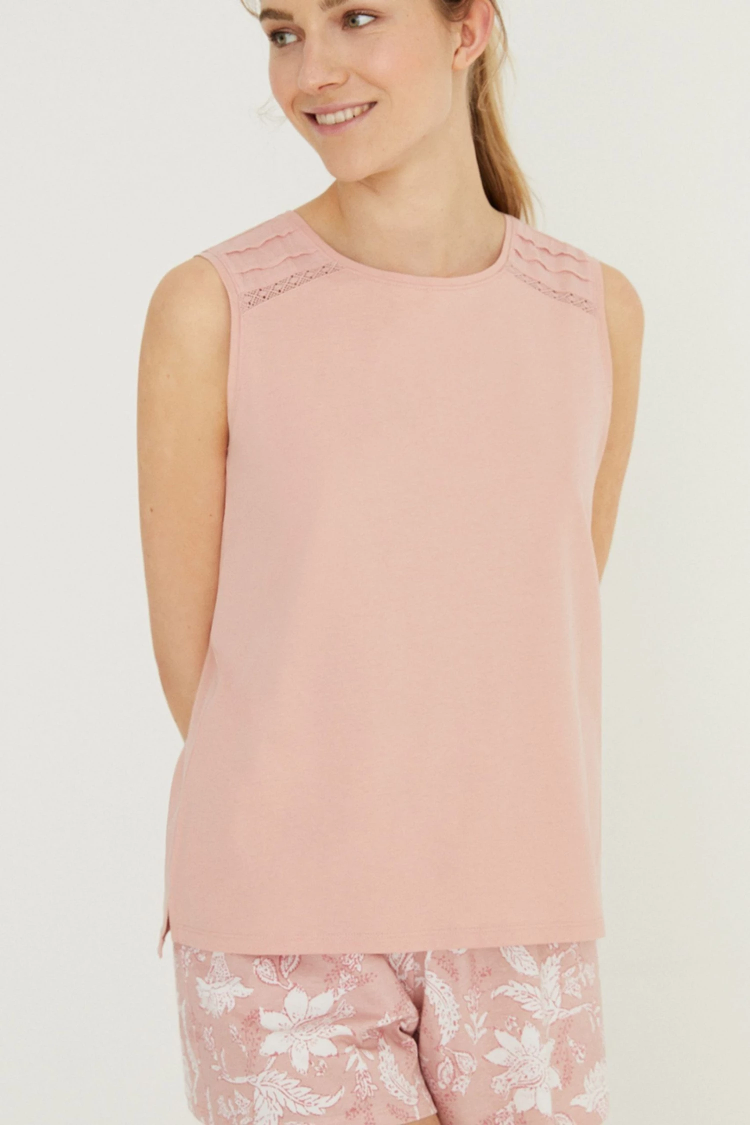 100% cotton pyjamas with short bottoms and sleeveless top. Round neck A-line top in pink with crochet shoulders detail. Opening at the neckline with mother-of-pearl button. Short printed bottoms with comfy elasticated waistband and cotton tie with tassel detail.