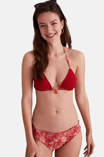 Get set for your beach plans with this crochet triangle bikini top in red, with ties at the back and neck. Just ideal. With removable cups so you can wear it how you choose.