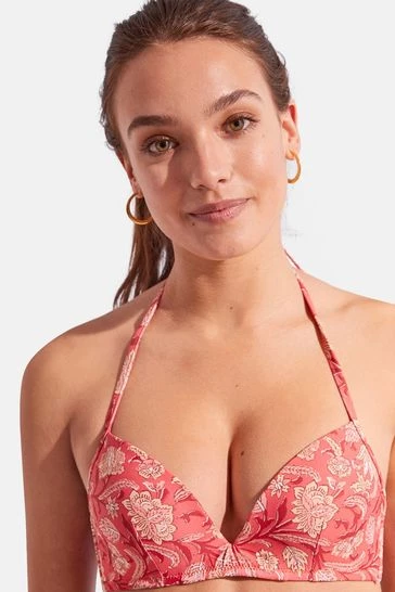 Bikini top with a red print. Underwired with cups, for added support and comfort.