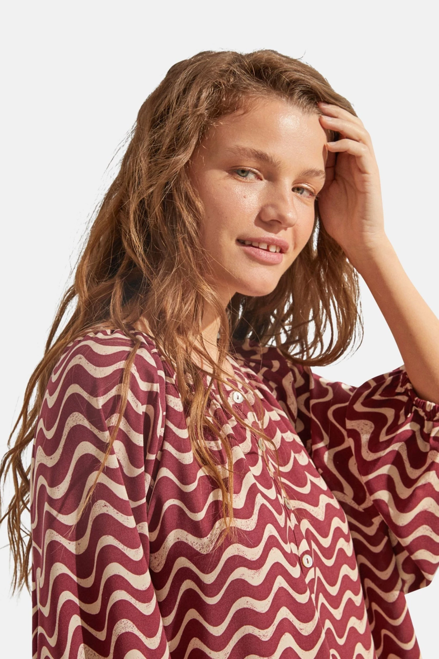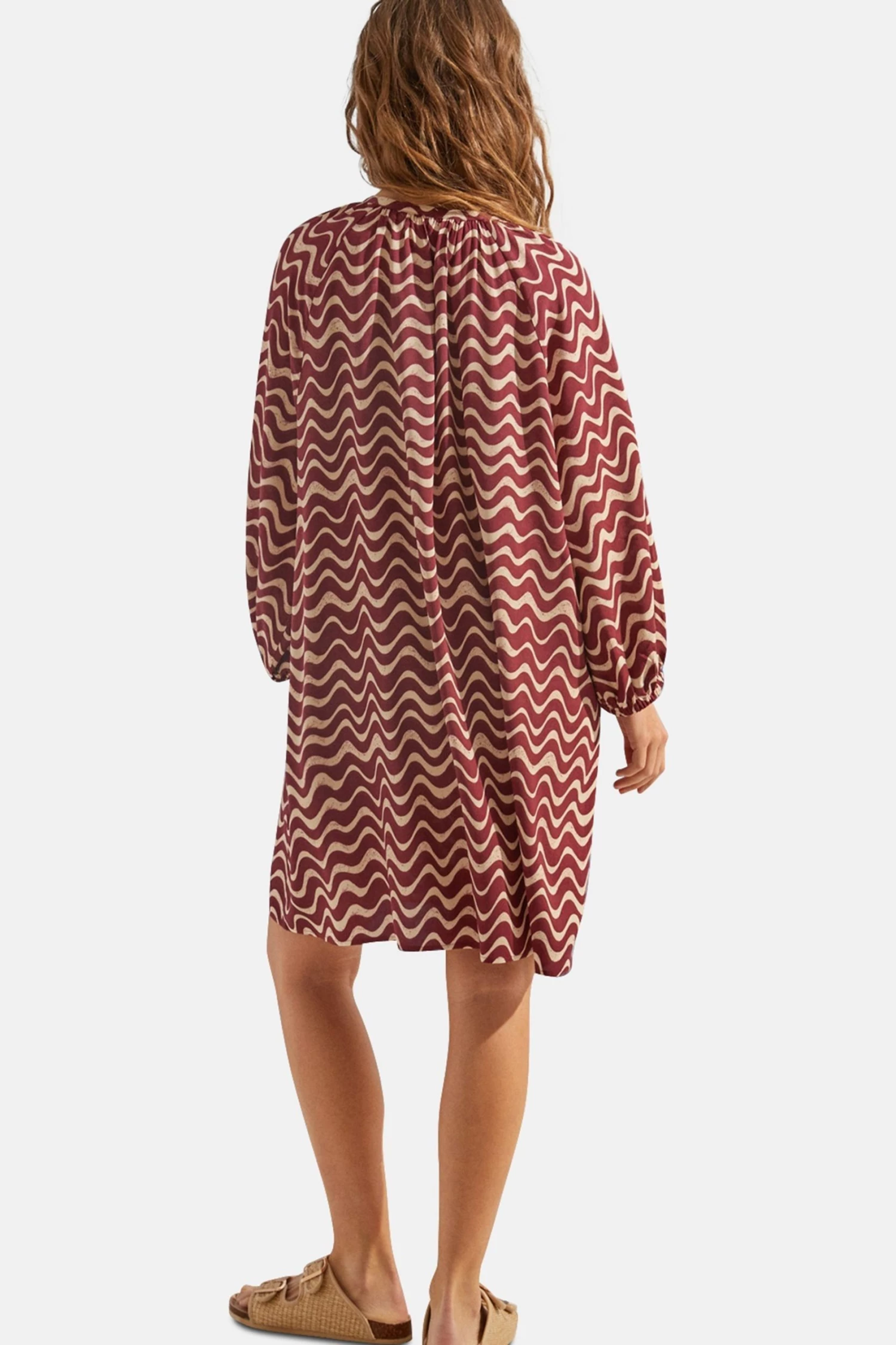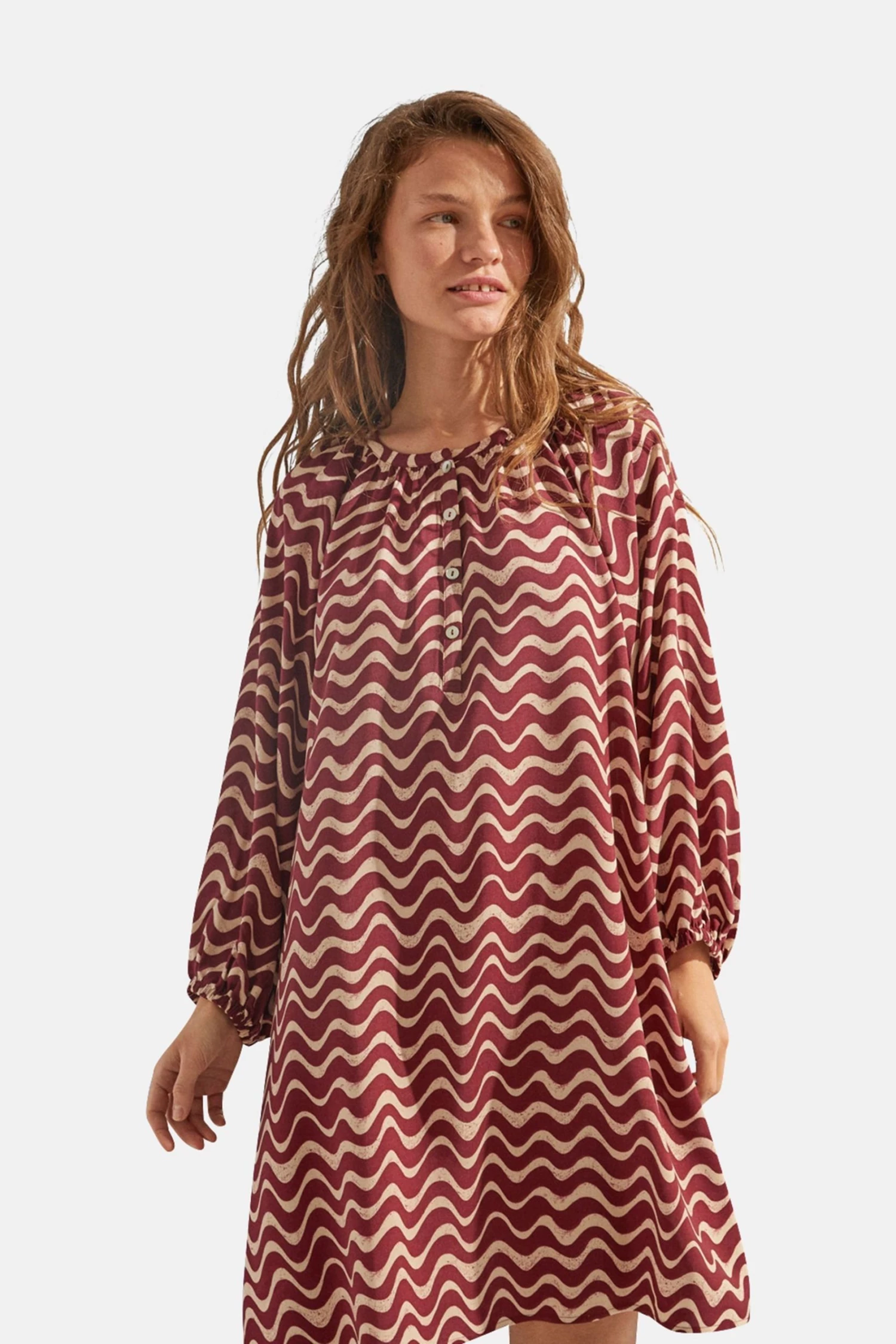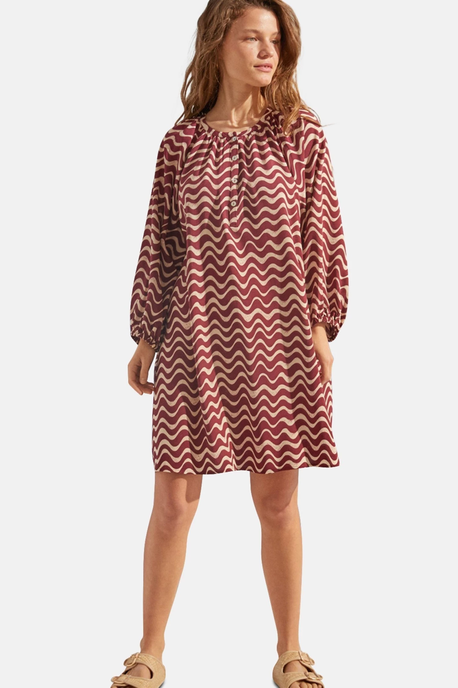 Tunic dress with 3/4 length sleeves, round neck and wave print , very on trend this year and, above all, this season. Ideal for the warm weather and perfect to wear both at night and in the day. As an extra detail, the cuffs are elasticated, giving it this special volume.