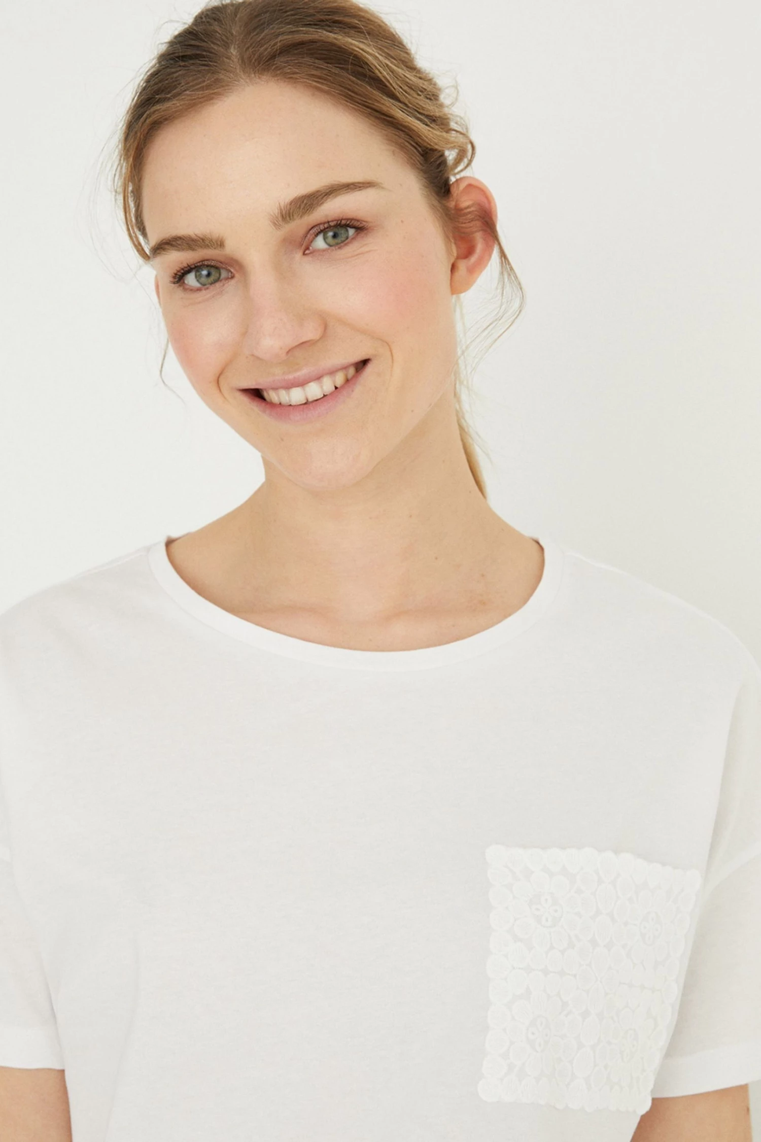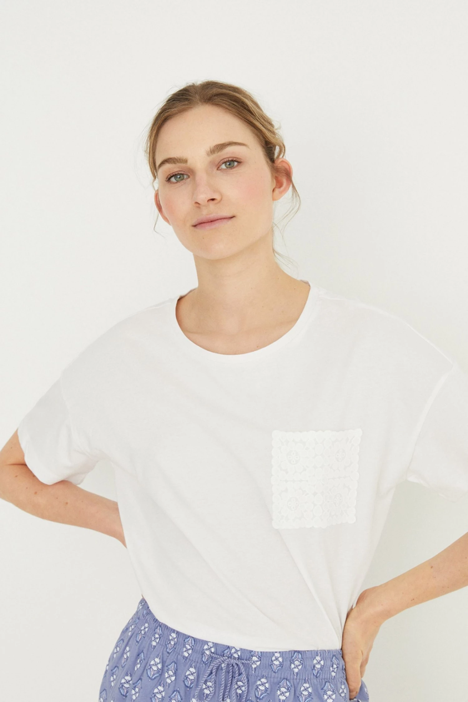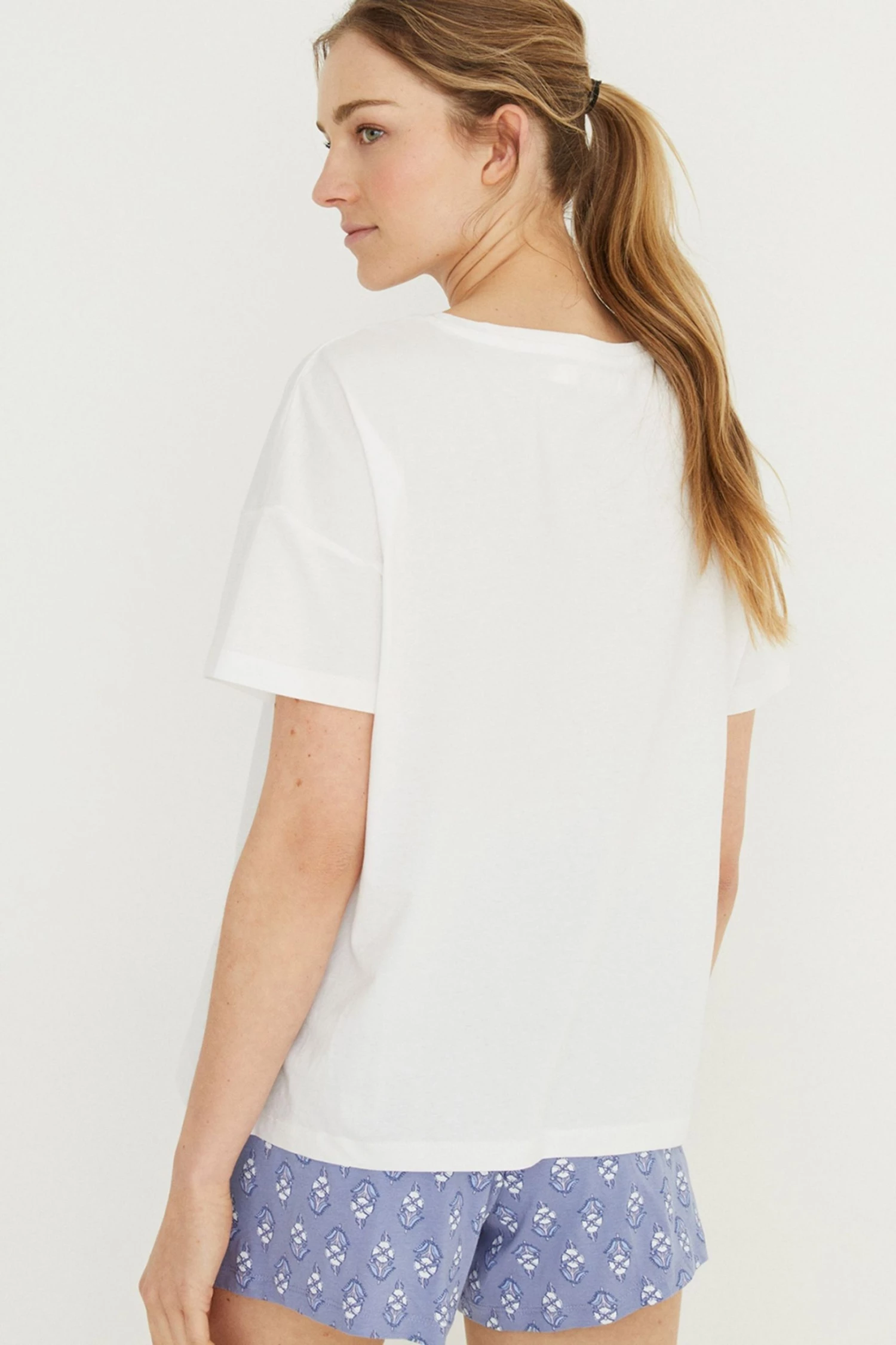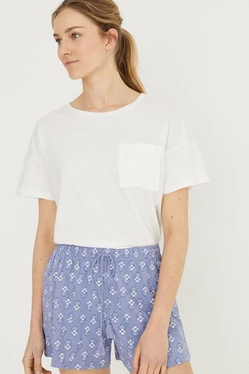 Cotton pyjamas with short sleeves and short bottoms. Top in white with dropped sleeves, round neck and crochet breast pocket. Short printed bottoms in blue with comfy elasticated waistband and cotton tie with tassel detail.