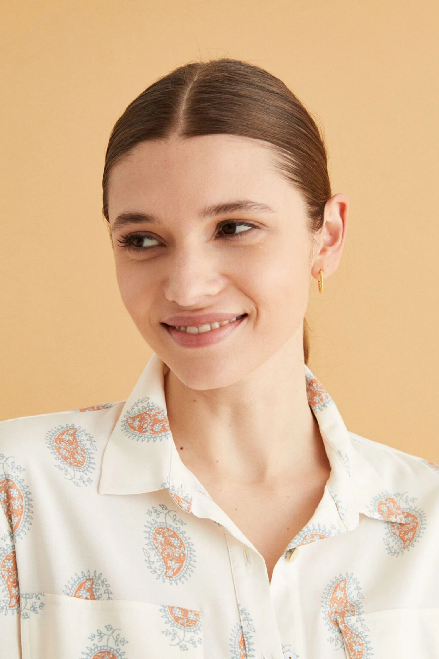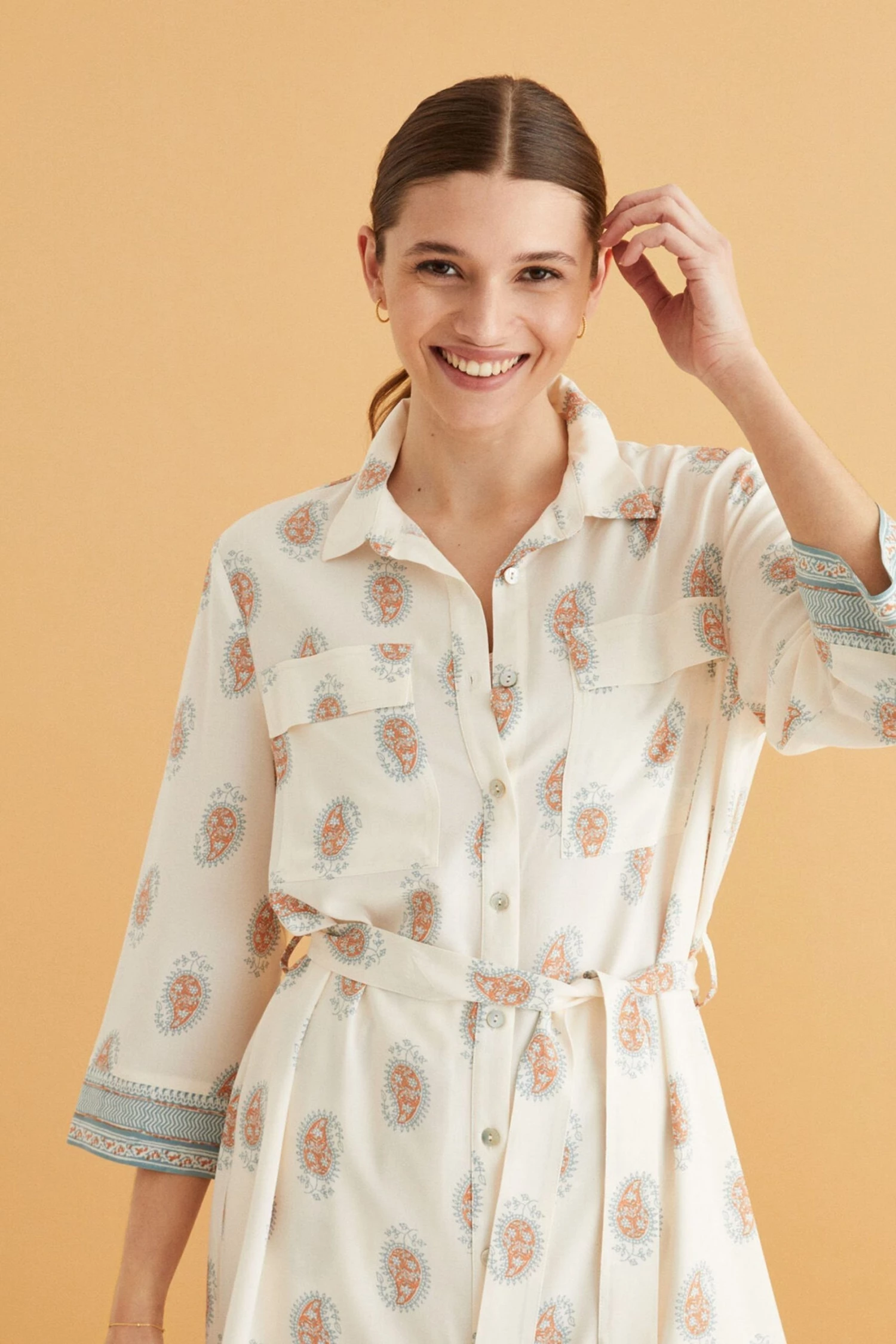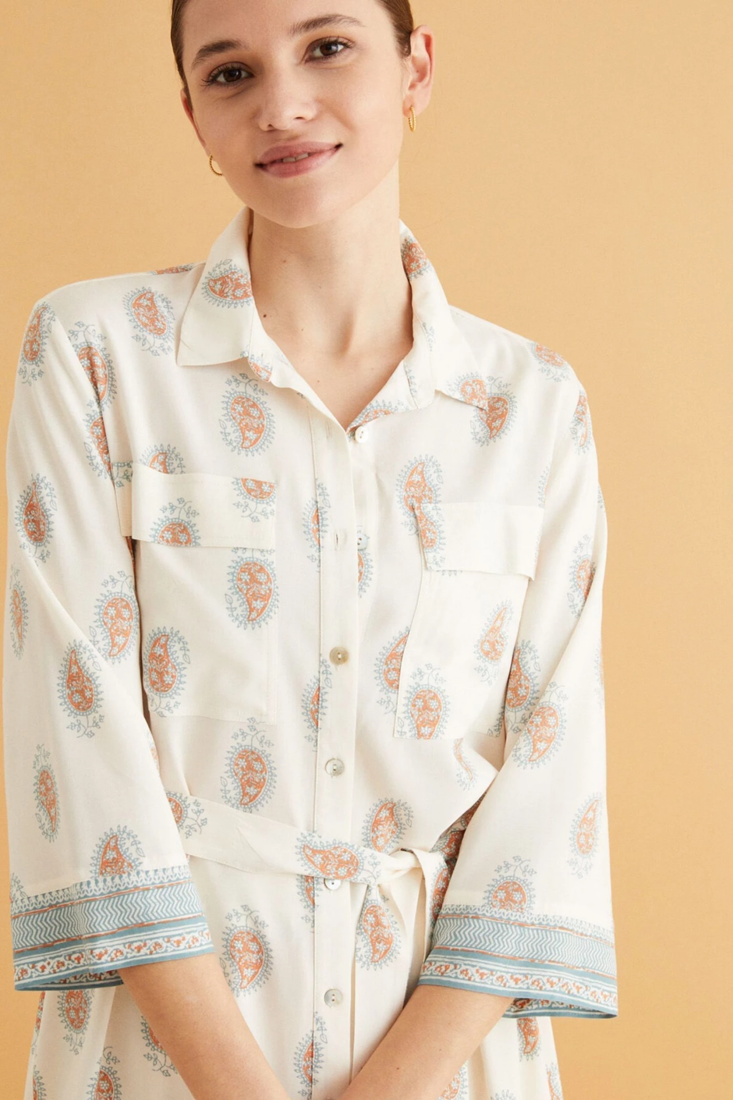 Ideal, right? A comfy and feminine midi camisole in essential white. Made in 100% viscose, it feels gorgeous, soft and fresh on spring days. With a shirt collar, the camisole has a safari vibe, with Indian print accents in terracotta tones. With blue borders at the cuffs and hem. With large breast pockets and a belt for the perfect fit. Spend your days in this comfy and relaxed camisole with a flattering drop, and stay feminine. Perfect for cosying up at home, day or night.