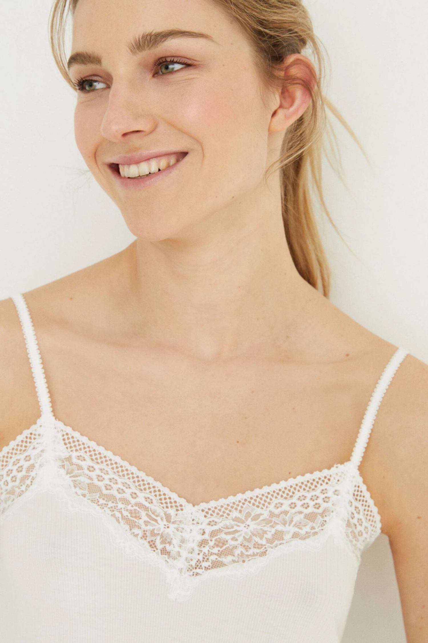 Short vest pyjamas, ribbed, in white. Top with lace V-neck and adjustable spaghetti straps. The bottoms come in an all-over print, with a thin elasticated waistband, drawstring and lace hem detail.